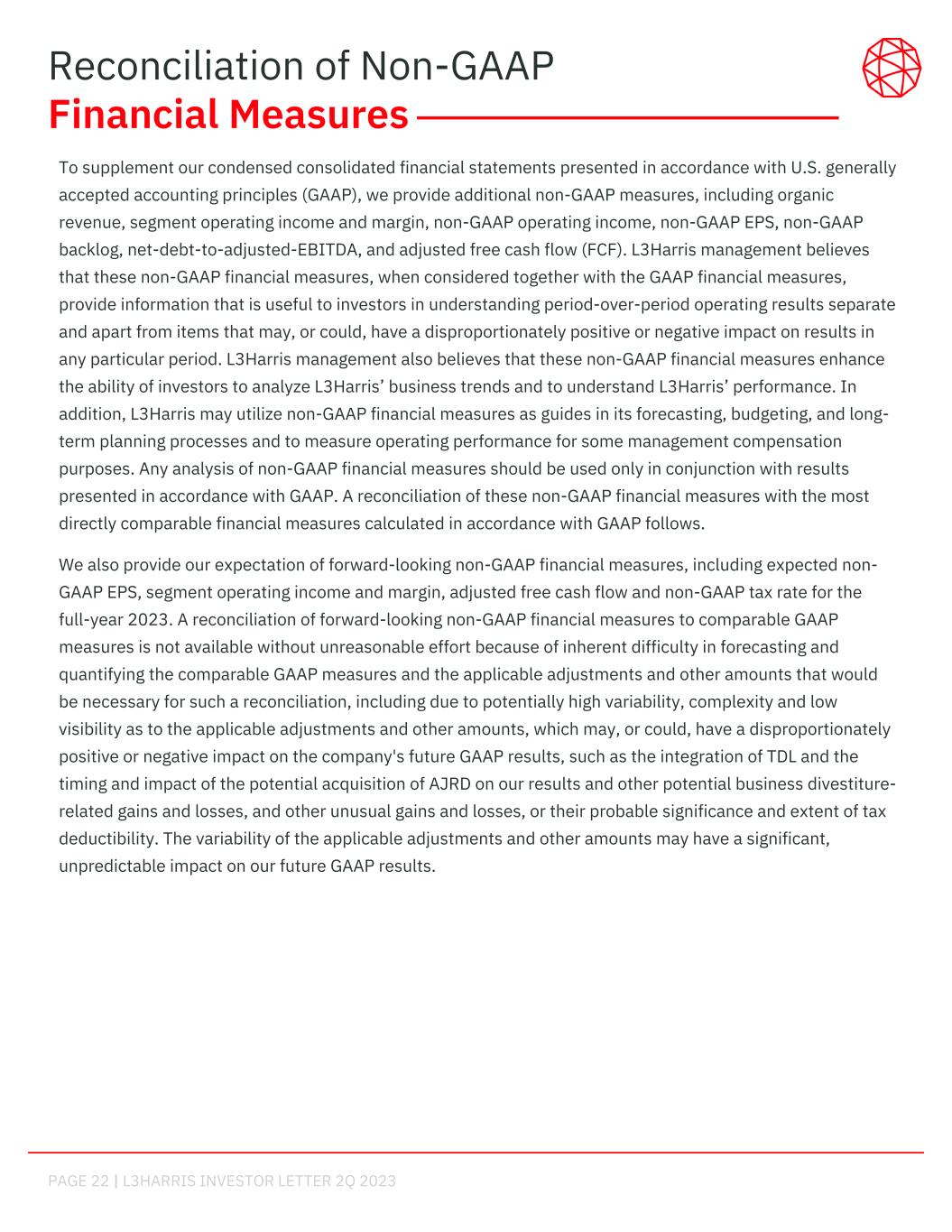 PAGE 22 | L3HARRIS INVESTOR LETTER 2Q 2023 To supplement our condensed consolidated financial statements presented in accordance with U.S. generally accepted accounting principles (GAAP), we provide additional non-GAAP measures, including organic revenue, segment operating income and margin, non-GAAP operating income, non-GAAP EPS, non-GAAP backlog, net-debt-to-adjusted-EBITDA, and adjusted free cash flow (FCF). L3Harris management believes that these non-GAAP financial measures, when considered together with the GAAP financial measures, provide information that is useful to investors in understanding period-over-period operating results separate and apart from items that may, or could, have a disproportionately positive or negative impact on results in any particular period. L3Harris management also believes that these non-GAAP financial measures enhance the ability of investors to analyze L3Harris’ business trends and to understand L3Harris’ performance. In addition, L3Harris may utilize non-GAAP financial measures as guides in its forecasting, budgeting, and long- term planning processes and to measure operating performance for some management compensation purposes. Any analysis of non-GAAP financial measures should be used only in conjunction with results presented in accordance with GAAP. A reconciliation of these non-GAAP financial measures with the most directly comparable financial measures calculated in accordance with GAAP follows. We also provide our expectation of forward-looking non-GAAP financial measures, including expected non- GAAP EPS, segment operating income and margin, adjusted free cash flow and non-GAAP tax rate for the full-year 2023. A reconciliation of forward-looking non-GAAP financial measures to comparable GAAP measures is not available without unreasonable effort because of inherent difficulty in forecasting and quantifying the comparable GAAP measures and the applicable adjustments and other amounts that would be necessary for such a reconciliation, including due to potentially high variability, complexity and low visibility as to the applicable adjustments and other amounts, which may, or could, have a disproportionately positive or negative impact on the company's future GAAP results, such as the integration of TDL and the timing and impact of the potential acquisition of AJRD on our results and other potential business divestiture- related gains and losses, and other unusual gains and losses, or their probable significance and extent of tax deductibility. The variability of the applicable adjustments and other amounts may have a significant, unpredictable impact on our future GAAP results. Reconciliation of Non-GAAP Financial Measures