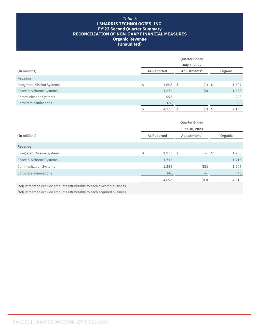 PAGE 23 | L3HARRIS INVESTOR LETTER 2Q 2023 Table 6 L3HARRIS TECHNOLOGIES, INC. FY'23 Second Quarter Summary RECONCILIATION OF NON-GAAP FINANCIAL MEASURES Organic Revenue (Unaudited) Quarter Ended July 1, 2022 (In millions) As Reported Adjustments1 Organic Revenue Integrated Mission Systems $ 1,608 $ (1) $ 1,607 Space & Airborne Systems 1,572 (6) 1,566 Communication Systems 993 — 993 Corporate eliminations (38) — (38) $ 4,135 $ (7) $ 4,128 Quarter Ended June 30, 2023 (In millions) As Reported Adjustments2 Organic Revenue Integrated Mission Systems $ 1,735 $ — $ 1,735 Space & Airborne Systems 1,715 — 1,715 Communication Systems 1,289 (83) 1,206 Corporate eliminations (46) — (46) 4,693 (83) 4,610 1Adjustment to exclude amounts attributable to each divested business. 2Adjustment to exclude amounts attributable to each acquired business. support