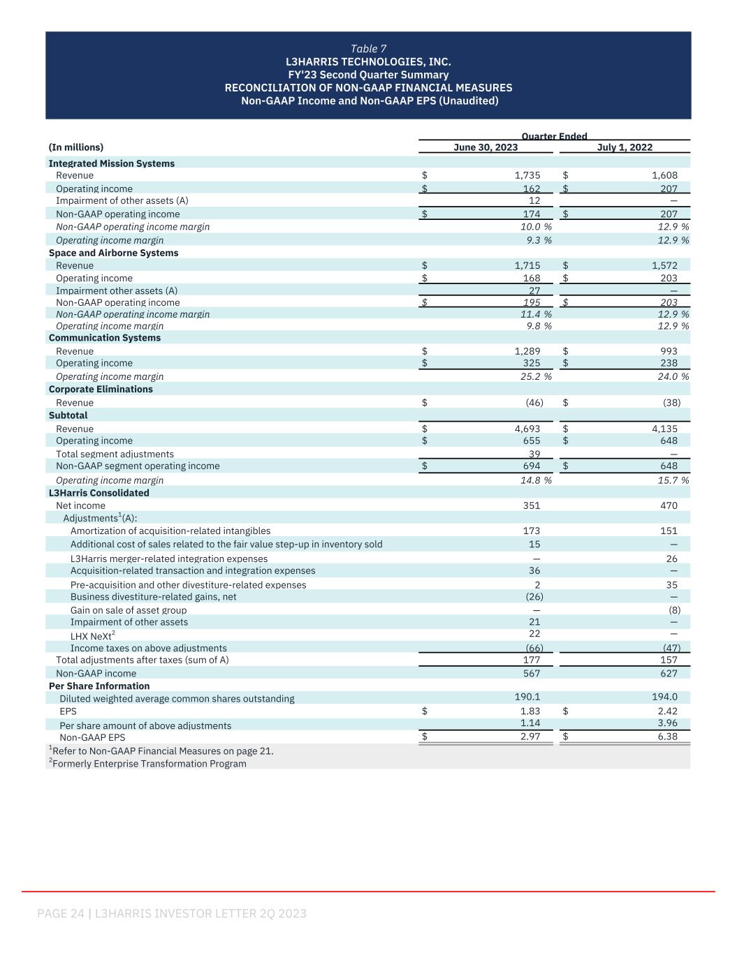 PAGE 24 | L3HARRIS INVESTOR LETTER 2Q 2023 Quarter Ended (In millions) June 30, 2023 July 1, 2022 Integrated Mission Systems Revenue $ 1,735 $ 1,608 Operating income $ 162 $ 207 Impairment of other assets (A) 12 — Non-GAAP operating income $ 174 $ 207 Non-GAAP operating income margin 10.0 % 12.9 % Operating income margin 9.3 % 12.9 % Space and Airborne Systems Revenue $ 1,715 $ 1,572 Operating income $ 168 $ 203 Impairment other assets (A) 27 — Non-GAAP operating income $ 195 $ 203 Non-GAAP operating income margin 11.4 % 12.9 % Operating income margin 9.8 % 12.9 % Communication Systems Revenue $ 1,289 $ 993 Operating income $ 325 $ 238 Operating income margin 25.2 % 24.0 % Corporate Eliminations Revenue $ (46) $ (38) Subtotal Revenue $ 4,693 $ 4,135 Operating income $ 655 $ 648 Total segment adjustments 39 — Non-GAAP segment operating income $ 694 $ 648 Operating income margin 14.8 % 15.7 % L3Harris Consolidated Net income 351 470 Adjustments1(A): Amortization of acquisition-related intangibles 173 151 Additional cost of sales related to the fair value step-up in inventory sold 15 — L3Harris merger-related integration expenses — 26 Acquisition-related transaction and integration expenses 36 — Pre-acquisition and other divestiture-related expenses 2 35 Business divestiture-related gains, net (26) — Gain on sale of asset group — (8) Impairment of other assets 21 — LHX NeXt2 22 — Income taxes on above adjustments (66) (47) Total adjustments after taxes (sum of A) 177 157 Non-GAAP income 567 627 Per Share Information Diluted weighted average common shares outstanding 190.1 194.0 EPS $ 1.83 $ 2.42 Per share amount of above adjustments 1.14 3.96 Non-GAAP EPS $ 2.97 $ 6.38 1Refer to Non-GAAP Financial Measures on page 21. 2Formerly Enterprise Transformation Program Table 7 L3HARRIS TECHNOLOGIES, INC. FY'23 Second Quarter Summary RECONCILIATION OF NON-GAAP FINANCIAL MEASURES Non-GAAP Income and Non-GAAP EPS (Unaudited)