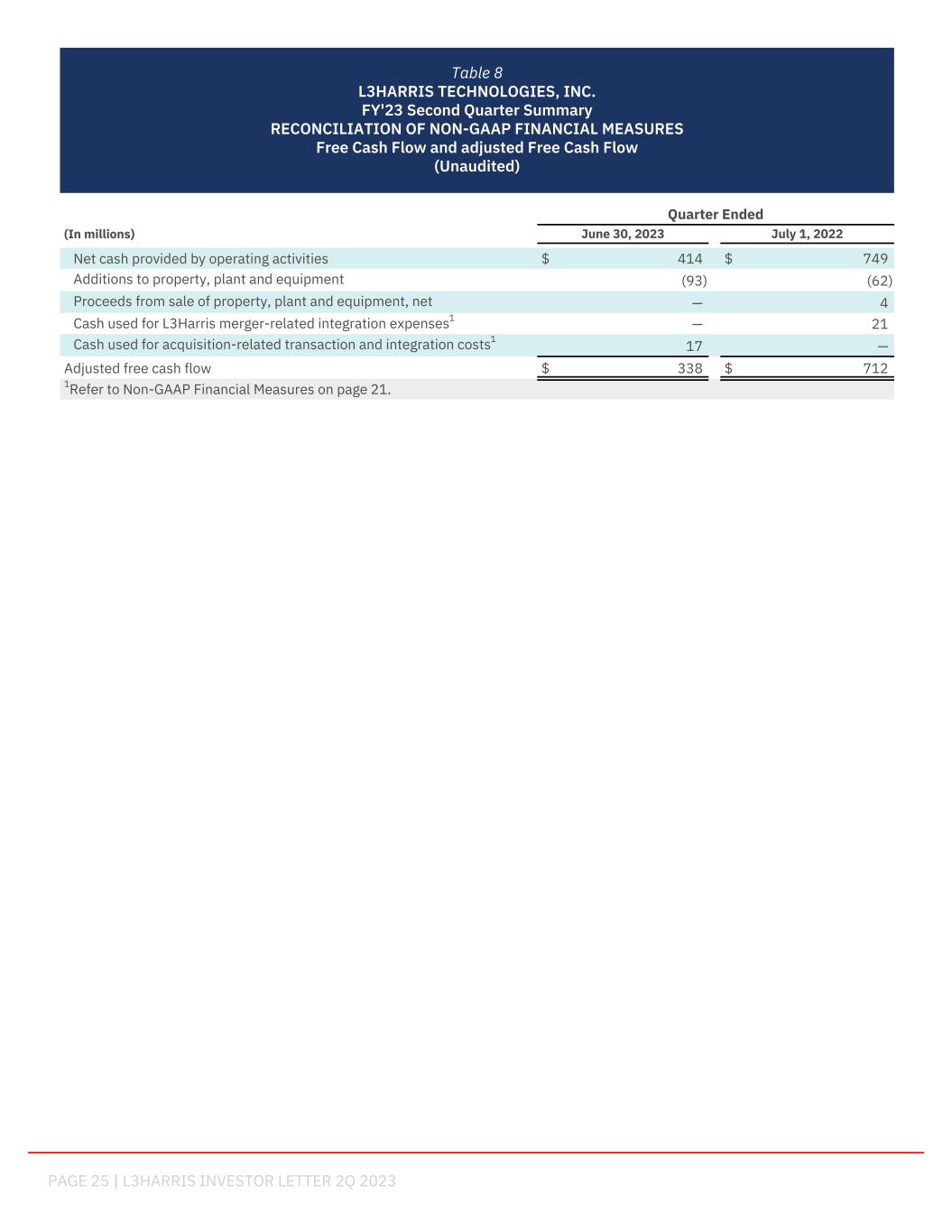 PAGE 25 | L3HARRIS INVESTOR LETTER 2Q 2023 Table 8 L3HARRIS TECHNOLOGIES, INC. FY'23 Second Quarter Summary RECONCILIATION OF NON-GAAP FINANCIAL MEASURES Free Cash Flow and adjusted Free Cash Flow (Unaudited) Quarter Ended (In millions) June 30, 2023 July 1, 2022 Net cash provided by operating activities $ 414 $ 749 Additions to property, plant and equipment (93) (62) Proceeds from sale of property, plant and equipment, net — 4 Cash used for L3Harris merger-related integration expenses1 — 21 Cash used for acquisition-related transaction and integration costs1 17 — Adjusted free cash flow $ 338 $ 712 1Refer to Non-GAAP Financial Measures on page 21. support