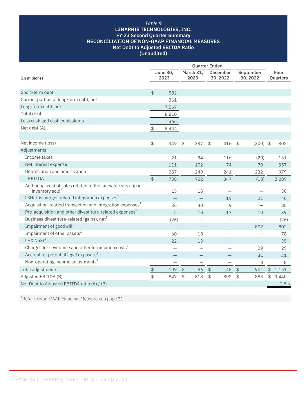 PAGE 26 | L3HARRIS INVESTOR LETTER 2Q 2023 Quarter Ended (In millions) June 30, 2023 March 31, 2023 December 30, 2022 September 30, 2022 Four Quarters Short-term debt $ 582 Current portion of long-term debt, net 361 Long-term debt, net 7,867 Total debt 8,810 Less cash and cash equivalents 366 Net debt (A) $ 8,444 Net income (loss) $ 349 $ 337 $ 416 $ (300) $ 802 Adjustments: Income taxes 21 34 116 (20) 151 Net interest expense 111 102 74 70 357 Depreciation and amortization 257 249 241 232 979 EBITDA $ 738 722 847 (18) 2,289 Additional cost of sales related to the fair value step-up in inventory sold1 15 15 — — 30 L3Harris merger-related integration expenses1 — — 19 21 40 Acquisition-related transaction and integration expenses1 36 40 9 — 85 Pre-acquisition and other divestiture-related expenses1 2 10 17 10 39 Business divestiture-related (gains), net1 (26) — — — (26) Impairment of goodwill1 — — — 802 802 Impairment of other assets1 60 18 — — 78 LHX NeXt1 22 13 — — 35 Charges for severance and other termination costs1 — — — 29 29 Accrual for potential legal exposure1 — — — 31 31 Non-operating income adjustments1 — — — 8 8 Total adjustments $ 109 $ 96 $ 45 $ 901 $ 1,151 Adjusted EBITDA (B) $ 847 $ 818 $ 892 $ 883 $ 3,440 Net Debt to Adjusted EBITDA ratio (A) / (B) 2.5 x 1Refer to Non-GAAP Financial Measures on page 21. Table 9 L3HARRIS TECHNOLOGIES, INC. FY'23 Second Quarter Summary RECONCILIATION OF NON-GAAP FINANCIAL MEASURES Net Debt to Adjusted EBITDA Ratio (Unaudited)