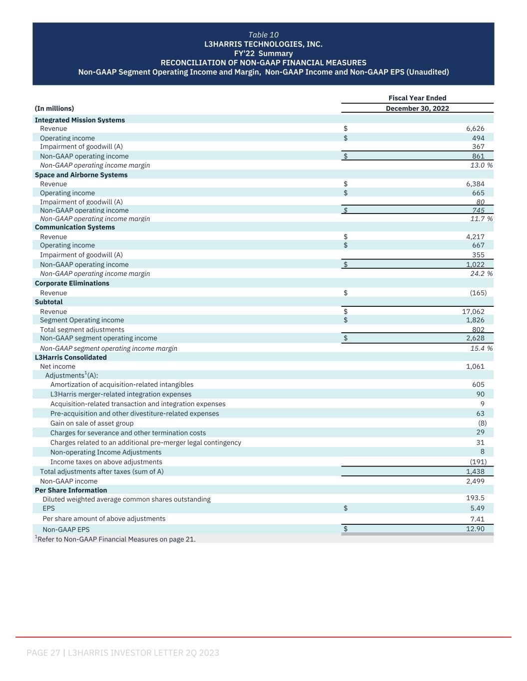 PAGE 27 | L3HARRIS INVESTOR LETTER 2Q 2023 Fiscal Year Ended (In millions) December 30, 2022 Integrated Mission Systems Revenue $ 6,626 Operating income $ 494 Impairment of goodwill (A) 367 Non-GAAP operating income $ 861 Non-GAAP operating income margin 13.0 % Space and Airborne Systems Revenue $ 6,384 Operating income $ 665 Impairment of goodwill (A) 80 Non-GAAP operating income $ 745 Non-GAAP operating income margin 11.7 % Communication Systems Revenue $ 4,217 Operating income $ 667 Impairment of goodwill (A) 355 Non-GAAP operating income $ 1,022 Non-GAAP operating income margin 24.2 % Corporate Eliminations Revenue $ (165) Subtotal Revenue $ 17,062 Segment Operating income $ 1,826 Total segment adjustments 802 Non-GAAP segment operating income $ 2,628 Non-GAAP segment operating income margin 15.4 % L3Harris Consolidated Net income 1,061 Adjustments1(A): Amortization of acquisition-related intangibles 605 L3Harris merger-related integration expenses 90 Acquisition-related transaction and integration expenses 9 Pre-acquisition and other divestiture-related expenses 63 Gain on sale of asset group (8) Charges for severance and other termination costs 29 Charges related to an additional pre-merger legal contingency 31 Non-operating Income Adjustments 8 Income taxes on above adjustments (191) Total adjustments after taxes (sum of A) 1,438 Non-GAAP income 2,499 Per Share Information Diluted weighted average common shares outstanding 193.5 EPS $ 5.49 Per share amount of above adjustments 7.41 Non-GAAP EPS $ 12.90 1Refer to Non-GAAP Financial Measures on page 21. Table 10 L3HARRIS TECHNOLOGIES, INC. FY'22 Summary RECONCILIATION OF NON-GAAP FINANCIAL MEASURES Non-GAAP Segment Operating Income and Margin, Non-GAAP Income and Non-GAAP EPS (Unaudited)