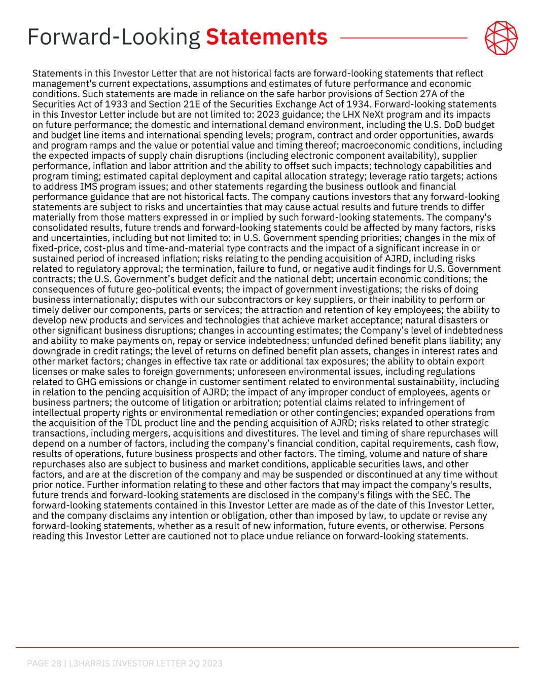 PAGE 28 | L3HARRIS INVESTOR LETTER 2Q 2023 Statements in this Investor Letter that are not historical facts are forward-looking statements that reflect management's current expectations, assumptions and estimates of future performance and economic conditions. Such statements are made in reliance on the safe harbor provisions of Section 27A of the Securities Act of 1933 and Section 21E of the Securities Exchange Act of 1934. Forward-looking statements in this Investor Letter include but are not limited to: 2023 guidance; the LHX NeXt program and its impacts on future performance; the domestic and international demand environment, including the U.S. DoD budget and budget line items and international spending levels; program, contract and order opportunities, awards and program ramps and the value or potential value and timing thereof; macroeconomic conditions, including the expected impacts of supply chain disruptions (including electronic component availability), supplier performance, inflation and labor attrition and the ability to offset such impacts; technology capabilities and program timing; estimated capital deployment and capital allocation strategy; leverage ratio targets; actions to address IMS program issues; and other statements regarding the business outlook and financial performance guidance that are not historical facts. The company cautions investors that any forward-looking statements are subject to risks and uncertainties that may cause actual results and future trends to differ materially from those matters expressed in or implied by such forward-looking statements. The company's consolidated results, future trends and forward-looking statements could be affected by many factors, risks and uncertainties, including but not limited to: in U.S. Government spending priorities; changes in the mix of fixed-price, cost-plus and time-and-material type contracts and the impact of a significant increase in or sustained period of increased inflation; risks relating to the pending acquisition of AJRD, including risks related to regulatory approval; the termination, failure to fund, or negative audit findings for U.S. Government contracts; the U.S. Government’s budget deficit and the national debt; uncertain economic conditions; the consequences of future geo-political events; the impact of government investigations; the risks of doing business internationally; disputes with our subcontractors or key suppliers, or their inability to perform or timely deliver our components, parts or services; the attraction and retention of key employees; the ability to develop new products and services and technologies that achieve market acceptance; natural disasters or other significant business disruptions; changes in accounting estimates; the Company’s level of indebtedness and ability to make payments on, repay or service indebtedness; unfunded defined benefit plans liability; any downgrade in credit ratings; the level of returns on defined benefit plan assets, changes in interest rates and other market factors; changes in effective tax rate or additional tax exposures; the ability to obtain export licenses or make sales to foreign governments; unforeseen environmental issues, including regulations related to GHG emissions or change in customer sentiment related to environmental sustainability, including in relation to the pending acquisition of AJRD; the impact of any improper conduct of employees, agents or business partners; the outcome of litigation or arbitration; potential claims related to infringement of intellectual property rights or environmental remediation or other contingencies; expanded operations from the acquisition of the TDL product line and the pending acquisition of AJRD; risks related to other strategic transactions, including mergers, acquisitions and divestitures. The level and timing of share repurchases will depend on a number of factors, including the company’s financial condition, capital requirements, cash flow, results of operations, future business prospects and other factors. The timing, volume and nature of share repurchases also are subject to business and market conditions, applicable securities laws, and other factors, and are at the discretion of the company and may be suspended or discontinued at any time without prior notice. Further information relating to these and other factors that may impact the company's results, future trends and forward-looking statements are disclosed in the company's filings with the SEC. The forward-looking statements contained in this Investor Letter are made as of the date of this Investor Letter, and the company disclaims any intention or obligation, other than imposed by law, to update or revise any forward-looking statements, whether as a result of new information, future events, or otherwise. Persons reading this Investor Letter are cautioned not to place undue reliance on forward-looking statements. Forward-Looking Statements