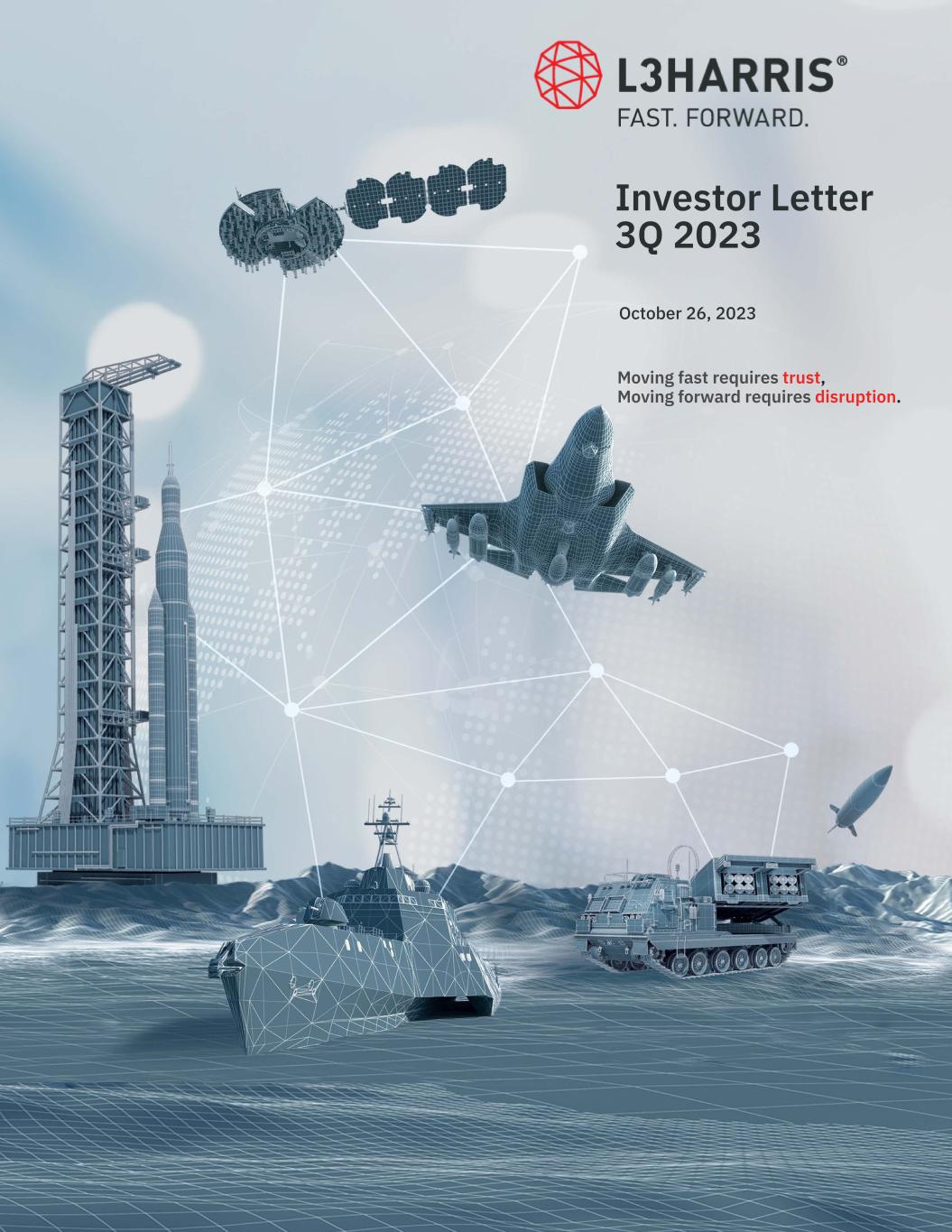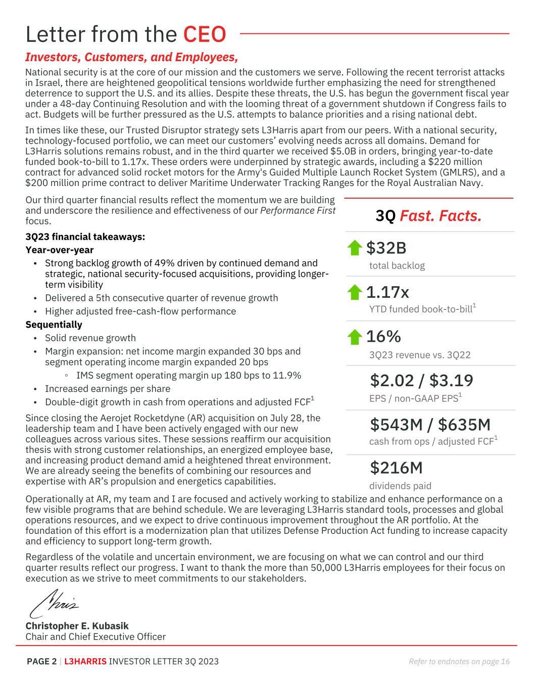 Letter from the CEO PAGE 2 | L3HARRIS INVESTOR LETTER 3Q 2023 Refer to endnotes on page 16 Operationally at AR, my team and I are focused and actively working to stabilize and enhance performance on a few visible programs that are behind schedule. We are leveraging L3Harris standard tools, processes and global operations resources, and we expect to drive continuous improvement throughout the AR portfolio. At the foundation of this effort is a modernization plan that utilizes Defense Production Act funding to increase capacity and efficiency to support long-term growth. Regardless of the volatile and uncertain environment, we are focusing on what we can control and our third quarter results reflect our progress. I want to thank the more than 50,000 L3Harris employees for their focus on execution as we strive to meet commitments to our stakeholders. Christopher E. Kubasik Chair and Chief Executive Officer 3Q Fast. Facts. 3Q23 revenue vs. 3Q22 YTD funded book-to-bill1 EPS / non-GAAP EPS1 cash from ops / adjusted FCF1 dividends paid $32B 16% $2.02 / $3.19 $543M / $635M $216M 1.17x total backlog Our third quarter financial results reflect the momentum we are building and underscore the resilience and effectiveness of our Performance First focus. 3Q23 financial takeaways: Year-over-year • Strong backlog growth of 49% driven by continued demand and strategic, national security-focused acquisitions, providing longer- term visibility • Delivered a 5th consecutive quarter of revenue growth • Higher adjusted free-cash-flow performance Sequentially • Solid revenue growth • Margin expansion: net income margin expanded 30 bps and segment operating income margin expanded 20 bps ◦ IMS segment operating margin up 180 bps to 11.9% • Increased earnings per share • Double-digit growth in cash from operations and adjusted FCF1 Since closing the Aerojet Rocketdyne (AR) acquisition on July 28, the leadership team and I have been actively engaged with our new colleagues across various sites. These sessions reaffirm our acquisition thesis with strong customer relationships, an energized employee base, and increasing product demand amid a heightened threat environment. We are already seeing the benefits of combining our resources and expertise with AR’s propulsion and energetics capabilities. Investors, Customers, and Employees, National security is at the core of our mission and the customers we serve. Following the recent terrorist attacks in Israel, there are heightened geopolitical tensions worldwide further emphasizing the need for strengthened deterrence to support the U.S. and its allies. Despite these threats, the U.S. has begun the government fiscal year under a 48-day Continuing Resolution and with the looming threat of a government shutdown if Congress fails to act. Budgets will be further pressured as the U.S. attempts to balance priorities and a rising national debt. In times like these, our Trusted Disruptor strategy sets L3Harris apart from our peers. With a national security, technology-focused portfolio, we can meet our customers’ evolving needs across all domains. Demand for L3Harris solutions remains robust, and in the third quarter we received $5.0B in orders, bringing year-to-date funded book-to-bill to 1.17x. These orders were underpinned by strategic awards, including a $220 million contract for advanced solid rocket motors for the Army's Guided Multiple Launch Rocket System (GMLRS), and a $200 million prime contract to deliver Maritime Underwater Tracking Ranges for the Royal Australian Navy.