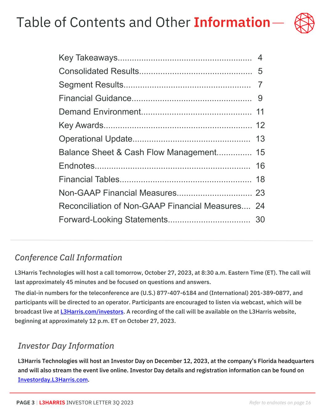PAGE 3 | L3HARRIS INVESTOR LETTER 3Q 2023 Refer to endnotes on page 16 Key Takeaways......................................................... 4 Consolidated Results................................................ 5 Segment Results...................................................... 7 Financial Guidance................................................... 9 Demand Environment............................................... 11 Key Awards............................................................... 12 Operational Update.................................................. 13 Balance Sheet & Cash Flow Management............... 15 Endnotes.................................................................. 16 Financial Tables........................................................ 18 Non-GAAP Financial Measures................................ 23 Reconciliation of Non-GAAP Financial Measures.... 24 Forward-Looking Statements................................... 30 Table of Contents and Other Information Conference Call Information L3Harris Technologies will host a call tomorrow, October 27, 2023, at 8:30 a.m. Eastern Time (ET). The call will last approximately 45 minutes and be focused on questions and answers. The dial-in numbers for the teleconference are (U.S.) 877-407-6184 and (International) 201-389-0877, and participants will be directed to an operator. Participants are encouraged to listen via webcast, which will be broadcast live at L3Harris.com/investors. A recording of the call will be available on the L3Harris website, beginning at approximately 12 p.m. ET on October 27, 2023. Investor Day Information L3Harris Technologies will host an Investor Day on December 12, 2023, at the company’s Florida headquarters and will also stream the event live online. Investor Day details and registration information can be found on Investorday.L3Harris.com.