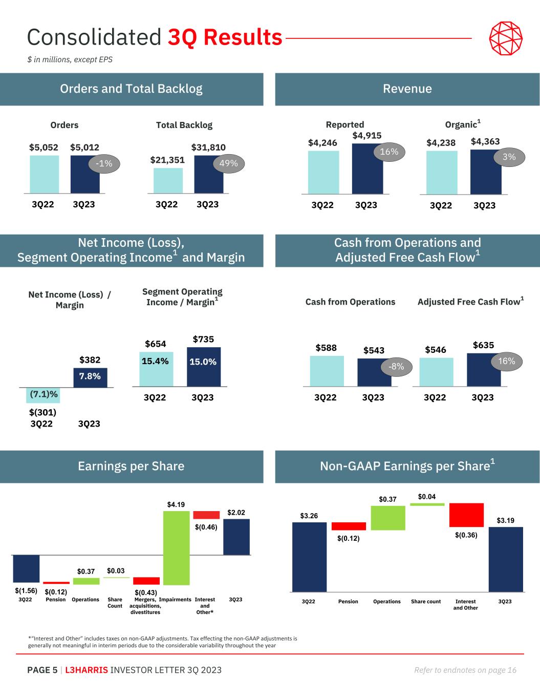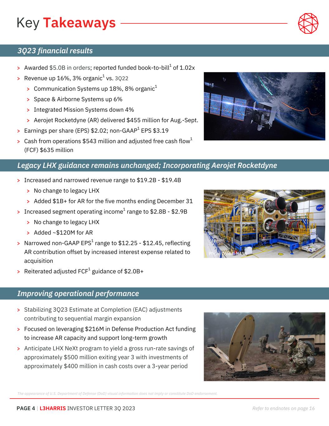 PAGE 4 | L3HARRIS INVESTOR LETTER 3Q 2023 Refer to endnotes on page 16 Key Takeaways > Awarded $5.0B in orders; reported funded book-to-bill1 of 1.02x > Revenue up 16%, 3% organic1 vs. 3Q22 > Communication Systems up 18%, 8% organic1 > Space & Airborne Systems up 6% > Integrated Mission Systems down 4% > Aerojet Rocketdyne (AR) delivered $455 million for Aug.-Sept. > Earnings per share (EPS) $2.02; non-GAAP1 EPS $3.19 > Cash from operations $543 million and adjusted free cash flow1 (FCF) $635 million > Increased and narrowed revenue range to $19.2B - $19.4B > No change to legacy LHX > Added $1B+ for AR for the five months ending December 31 > Increased segment operating income1 range to $2.8B - $2.9B > No change to legacy LHX > Added ~$120M for AR > Narrowed non-GAAP EPS1 range to $12.25 - $12.45, reflecting AR contribution offset by increased interest expense related to acquisition > Reiterated adjusted FCF1 guidance of $2.0B+ Legacy LHX guidance remains unchanged; Incorporating Aerojet Rocketdyne Improving operational performance > Stabilizing 3Q23 Estimate at Completion (EAC) adjustments contributing to sequential margin expansion > Focused on leveraging $216M in Defense Production Act funding to increase AR capacity and support long-term growth > Anticipate LHX NeXt program to yield a gross run-rate savings of approximately $500 million exiting year 3 with investments of approximately $400 million in cash costs over a 3-year period 3Q23 financial results The appearance of U.S. Department of Defense (DoD) visual information does not imply or constitute DoD endorsement. Photo Credit: NASA