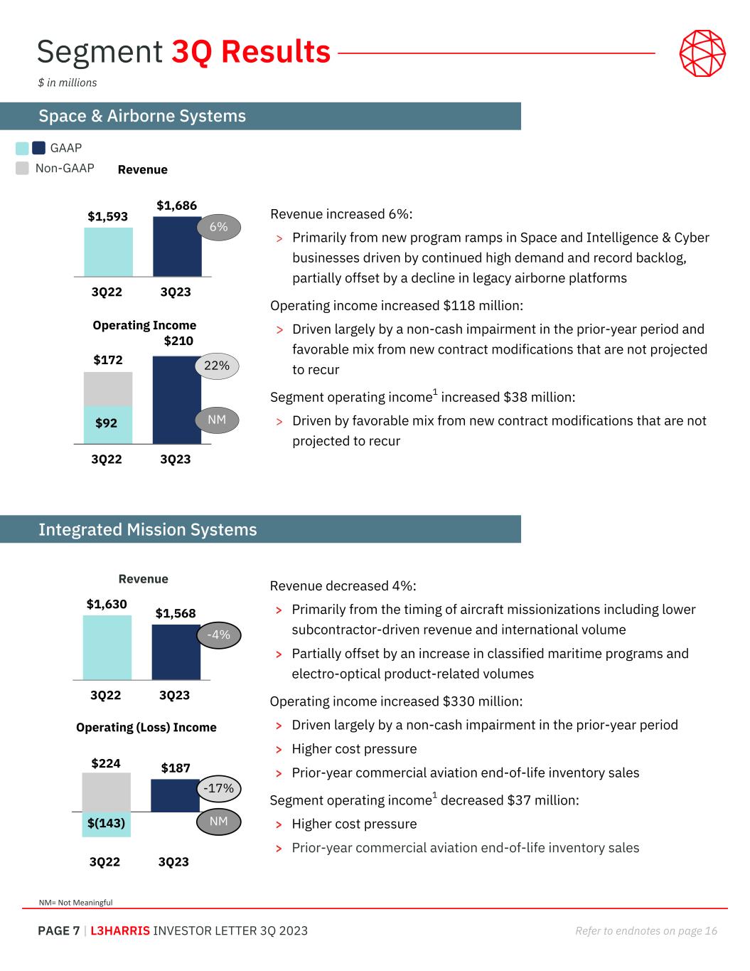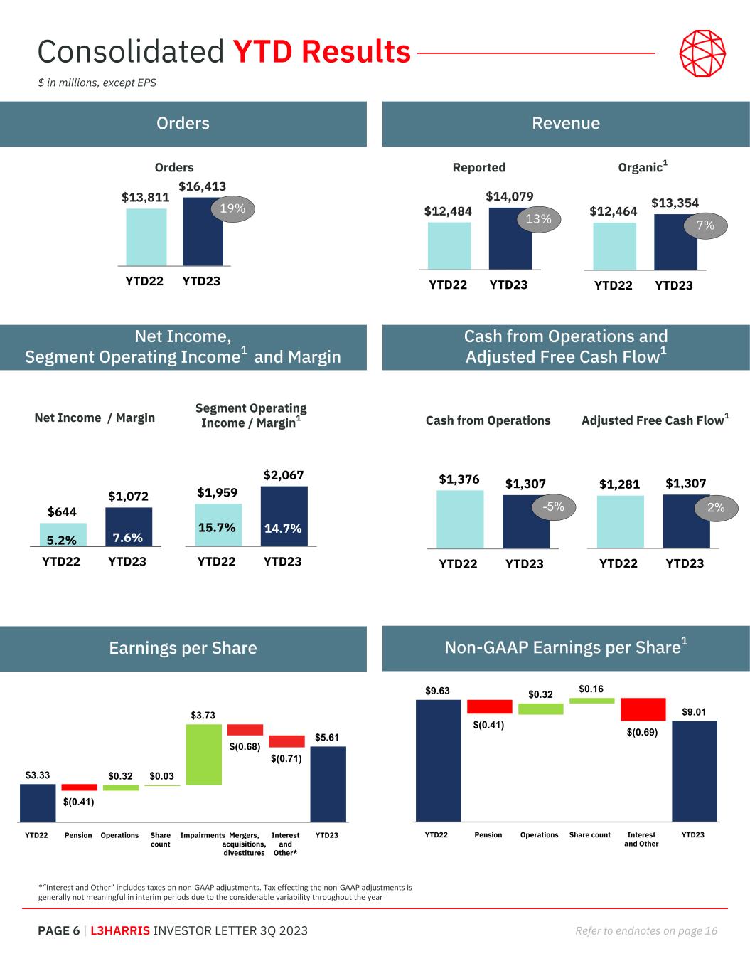 PAGE 6 | L3HARRIS INVESTOR LETTER 3Q 2023 Refer to endnotes on page 16 Organic1 Adjusted Free Cash Flow1 Cash from Operations and Adjusted Free Cash Flow1 Earnings per Share RevenueOrders $9.63 $(0.41) $0.32 $0.16 $(0.69) $9.01 YTD22 Pension Operations Share count Interest and Other YTD23 $3.33 $(0.41) $0.32 $0.03 $3.73 $(0.68) $(0.71) $5.61 YTD22 Pension Operations Share count Impairments Mergers, acquisitions, divestitures Interest and Other* YTD23 Consolidated YTD Results $12,484 $14,079 YTD22 YTD23 $13,811 $16,413 YTD22 YTD23 19% $12,464 $13,354 YTD22 YTD23 7% $1,376 $1,307 YTD22 YTD23 $1,281 $1,307 YTD22 YTD23 Cash from Operations $644 $1,072 5.2% 7.6% YTD22 YTD23 $1,959 $2,067 15.7% 14.7% YTD22 YTD23 Net Income / Margin Segment Operating Income / Margin1 ReportedOrders Net Income, Segment Operating Income1 and Margin Non-GAAP Earnings per Share1 $ in millions, except EPS *“Interest and Other” includes taxes on non-GAAP adjustments. Tax effecting the non-GAAP adjustments is generally not meaningful in interim periods due to the considerable variability throughout the year 13% -5% 2%