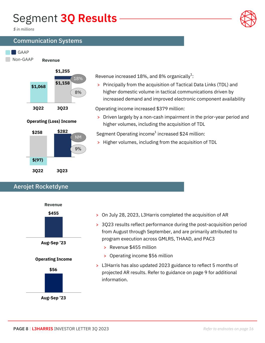 PAGE 7 | L3HARRIS INVESTOR LETTER 3Q 2023 Refer to endnotes on page 16 Revenue increased 6%: > Primarily from new program ramps in Space and Intelligence & Cyber businesses driven by continued high demand and record backlog, partially offset by a decline in legacy airborne platforms Operating income increased $118 million: > Driven largely by a non-cash impairment in the prior-year period and favorable mix from new contract modifications that are not projected to recur Segment operating income1 increased $38 million: > Driven by favorable mix from new contract modifications that are not projected to recur $1,630 $1,568 3Q22 3Q23 $1,593 $1,686 3Q22 3Q23 6% -4% Segment 3Q Results Integrated Mission Systems Space & Airborne Systems Revenue Revenue decreased 4%: > Primarily from the timing of aircraft missionizations including lower subcontractor-driven revenue and international volume > Partially offset by an increase in classified maritime programs and electro-optical product-related volumes Operating income increased $330 million: > Driven largely by a non-cash impairment in the prior-year period > Higher cost pressure > Prior-year commercial aviation end-of-life inventory sales Segment operating income1 decreased $37 million: > Higher cost pressure > Prior-year commercial aviation end-of-life inventory sales $ in millions Operating (Loss) Income 3Q22 3Q23 $187 -17% NM$(143) Operating Income 3Q22 3Q23 $210 $172 22% NM GAAP Non-GAAP $224 $92 Revenue NM= Not Meaningful