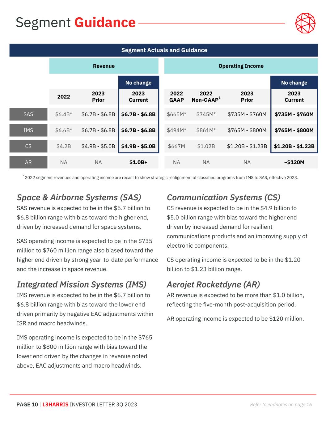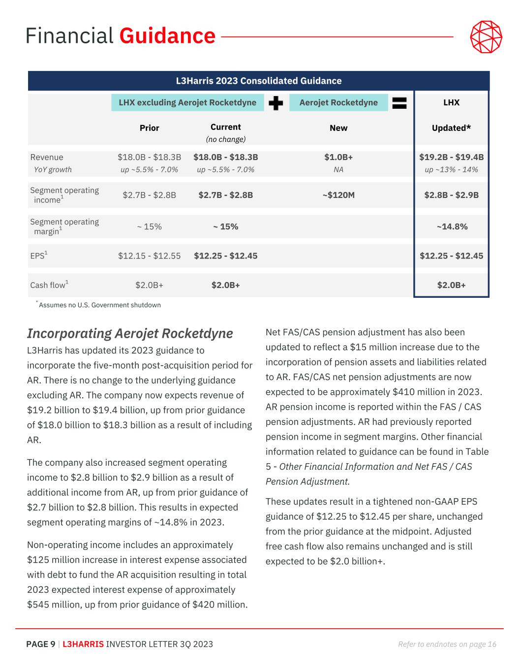 PAGE 9 | L3HARRIS INVESTOR LETTER 3Q 2023 Refer to endnotes on page 16 Incorporating Aerojet Rocketdyne L3Harris has updated its 2023 guidance to incorporate the five-month post-acquisition period for AR. There is no change to the underlying guidance excluding AR. The company now expects revenue of $19.2 billion to $19.4 billion, up from prior guidance of $18.0 billion to $18.3 billion as a result of including AR. The company also increased segment operating income to $2.8 billion to $2.9 billion as a result of additional income from AR, up from prior guidance of $2.7 billion to $2.8 billion. This results in expected segment operating margins of ~14.8% in 2023. Non-operating income includes an approximately $125 million increase in interest expense associated with debt to fund the AR acquisition resulting in total 2023 expected interest expense of approximately $545 million, up from prior guidance of $420 million. L3Harris 2023 Consolidated Guidance LHX excluding Aerojet Rocketdyne Aerojet Rocketdyne LHX Prior Current (no change) New Updated* Revenue YoY growth $18.0B - $18.3B up ~5.5% - 7.0% $18.0B - $18.3B up ~5.5% - 7.0% $1.0B+ NA $19.2B - $19.4B up ~13% - 14% Segment operating income1 $2.7B - $2.8B $2.7B - $2.8B ~$120M $2.8B - $2.9B Segment operating margin1 ~ 15% ~ 15% ~14.8% EPS1 $12.15 - $12.55 $12.25 - $12.45 $12.25 - $12.45 Cash flow1 $2.0B+ $2.0B+ $2.0B+ Financial Guidance Net FAS/CAS pension adjustment has also been updated to reflect a $15 million increase due to the incorporation of pension assets and liabilities related to AR. FAS/CAS net pension adjustments are now expected to be approximately $410 million in 2023. AR pension income is reported within the FAS / CAS pension adjustments. AR had previously reported pension income in segment margins. Other financial information related to guidance can be found in Table 5 - Other Financial Information and Net FAS / CAS Pension Adjustment. These updates result in a tightened non-GAAP EPS guidance of $12.25 to $12.45 per share, unchanged from the prior guidance at the midpoint. Adjusted free cash flow also remains unchanged and is still expected to be $2.0 billion+. * Assumes no U.S. Government shutdown