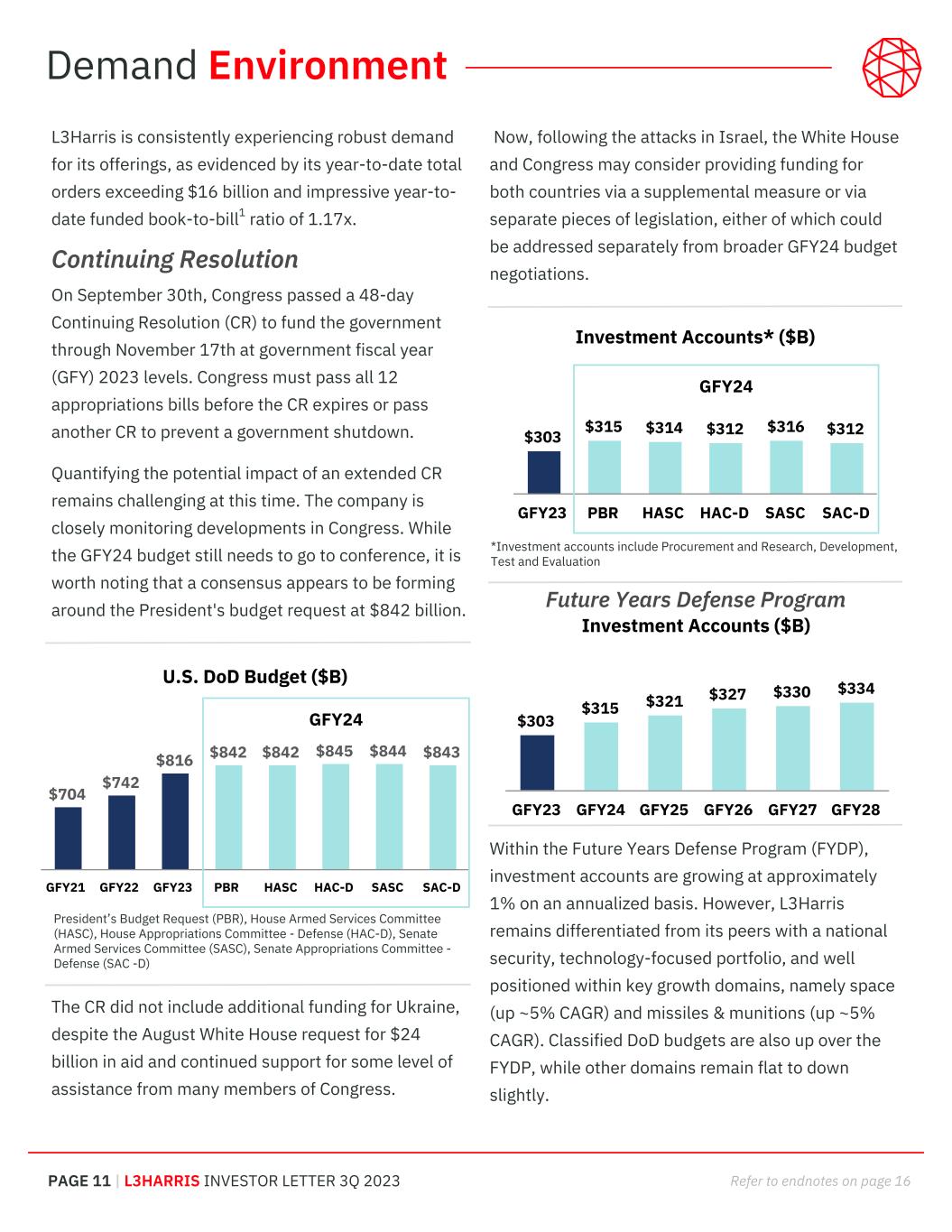 PAGE 11 | L3HARRIS INVESTOR LETTER 3Q 2023 Refer to endnotes on page 16 Now, following the attacks in Israel, the White House and Congress may consider providing funding for both countries via a supplemental measure or via separate pieces of legislation, either of which could be addressed separately from broader GFY24 budget negotiations. L3Harris is consistently experiencing robust demand for its offerings, as evidenced by its year-to-date total orders exceeding $16 billion and impressive year-to- date funded book-to-bill1 ratio of 1.17x. Continuing Resolution On September 30th, Congress passed a 48-day Continuing Resolution (CR) to fund the government through November 17th at government fiscal year (GFY) 2023 levels. Congress must pass all 12 appropriations bills before the CR expires or pass another CR to prevent a government shutdown. Quantifying the potential impact of an extended CR remains challenging at this time. The company is closely monitoring developments in Congress. While the GFY24 budget still needs to go to conference, it is worth noting that a consensus appears to be forming around the President's budget request at $842 billion. The CR did not include additional funding for Ukraine, despite the August White House request for $24 billion in aid and continued support for some level of assistance from many members of Congress. U.S. DoD Budget ($B) $704 $742 $816 $842 $842 $845 $844 $843 GFY21 GFY22 GFY23 PBR HASC HAC-D SASC SAC-D GFY24 Demand Environment President’s Budget Request (PBR), House Armed Services Committee (HASC), House Appropriations Committee - Defense (HAC-D), Senate Armed Services Committee (SASC), Senate Appropriations Committee - Defense (SAC -D) Future Years Defense Program Within the Future Years Defense Program (FYDP), investment accounts are growing at approximately 1% on an annualized basis. However, L3Harris remains differentiated from its peers with a national security, technology-focused portfolio, and well positioned within key growth domains, namely space (up ~5% CAGR) and missiles & munitions (up ~5% CAGR). Classified DoD budgets are also up over the FYDP, while other domains remain flat to down slightly. Investment Accounts* ($B) $303 $315 $314 $312 $316 $312 GFY23 PBR HASC HAC-D SASC SAC-D GFY24 Investment Accounts ($B) $303 $315 $321 $327 $330 $334 GFY23 GFY24 GFY25 GFY26 GFY27 GFY28 *Investment accounts include Procurement and Research, Development, Test and Evaluation