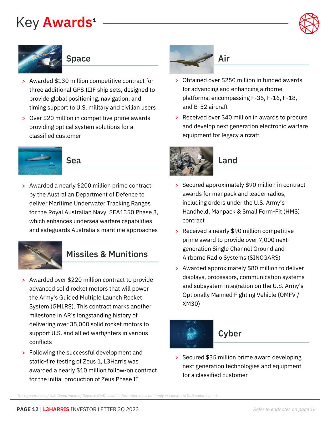 PAGE 12 | L3HARRIS INVESTOR LETTER 3Q 2023 Refer to endnotes on page 16 > Obtained over $250 million in funded awards for advancing and enhancing airborne platforms, encompassing F-35, F-16, F-18, and B-52 aircraft > Received over $40 million in awards to procure and develop next generation electronic warfare equipment for legacy aircraft > Secured approximately $90 million in contract awards for manpack and leader radios, including orders under the U.S. Army’s Handheld, Manpack & Small Form-Fit (HMS) contract > Received a nearly $90 million competitive prime award to provide over 7,000 next- generation Single Channel Ground and Airborne Radio Systems (SINCGARS) > Awarded approximately $80 million to deliver displays, processors, communication systems and subsystem integration on the U.S. Army’s Optionally Manned Fighting Vehicle (OMFV / XM30) > Secured $35 million prime award developing next generation technologies and equipment for a classified customer > Awarded $130 million competitive contract for three additional GPS IIIF ship sets, designed to provide global positioning, navigation, and timing support to U.S. military and civilian users > Over $20 million in competitive prime awards providing optical system solutions for a classified customer > Awarded a nearly $200 million prime contract by the Australian Department of Defence to deliver Maritime Underwater Tracking Ranges for the Royal Australian Navy. SEA1350 Phase 3, which enhances undersea warfare capabilities and safeguards Australia’s maritime approaches > Awarded over $220 million contract to provide advanced solid rocket motors that will power the Army's Guided Multiple Launch Rocket System (GMLRS). This contract marks another milestone in AR’s longstanding history of delivering over 35,000 solid rocket motors to support U.S. and allied warfighters in various conflicts > Following the successful development and static-fire testing of Zeus 1, L3Harris was awarded a nearly $10 million follow-on contract for the initial production of Zeus Phase II Key Awards Space Air LandSea Cyber 1 The appearance of U.S. Department of Defense (DoD) visual information does not imply or constitute DoD endorsement. Missiles & Munitions