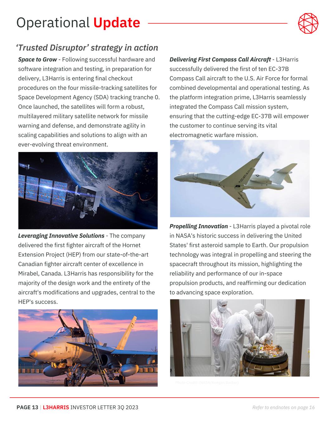 PAGE 13 | L3HARRIS INVESTOR LETTER 3Q 2023 Refer to endnotes on page 16 Space to Grow - Following successful hardware and software integration and testing, in preparation for delivery, L3Harris is entering final checkout procedures on the four missile-tracking satellites for Space Development Agency (SDA) tracking tranche 0. Once launched, the satellites will form a robust, multilayered military satellite network for missile warning and defense, and demonstrate agility in scaling capabilities and solutions to align with an ever-evolving threat environment. Leveraging Innovative Solutions - The company delivered the first fighter aircraft of the Hornet Extension Project (HEP) from our state-of-the-art Canadian fighter aircraft center of excellence in Mirabel, Canada. L3Harris has responsibility for the majority of the design work and the entirety of the aircraft's modifications and upgrades, central to the HEP's success. Delivering First Compass Call Aircraft - L3Harris successfully delivered the first of ten EC-37B Compass Call aircraft to the U.S. Air Force for formal combined developmental and operational testing. As the platform integration prime, L3Harris seamlessly integrated the Compass Call mission system, ensuring that the cutting-edge EC-37B will empower the customer to continue serving its vital electromagnetic warfare mission. Propelling Innovation - L3Harris played a pivotal role in NASA's historic success in delivering the United States' first asteroid sample to Earth. Our propulsion technology was integral in propelling and steering the spacecraft throughout its mission, highlighting the reliability and performance of our in-space propulsion products, and reaffirming our dedication to advancing space exploration. ‘Trusted Disruptor’ strategy in action Operational Update Photo Credit: (NASA/Keegan Barber)