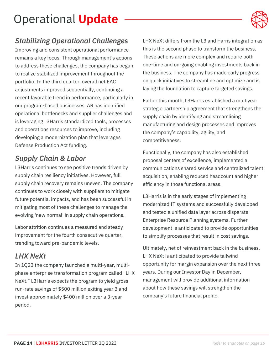 PAGE 14 | L3HARRIS INVESTOR LETTER 3Q 2023 Refer to endnotes on page 16 Stabilizing Operational Challenges Improving and consistent operational performance remains a key focus. Through management’s actions to address these challenges, the company has begun to realize stabilized improvement throughout the portfolio. In the third quarter, overall net EAC adjustments improved sequentially, continuing a recent favorable trend in performance, particularly in our program-based businesses. AR has identified operational bottlenecks and supplier challenges and is leveraging L3Harris standardized tools, processes and operations resources to improve, including developing a modernization plan that leverages Defense Production Act funding. Supply Chain & Labor L3Harris continues to see positive trends driven by supply chain resiliency initiatives. However, full supply chain recovery remains uneven. The company continues to work closely with suppliers to mitigate future potential impacts, and has been successful in mitigating most of these challenges to manage the evolving 'new normal' in supply chain operations. Labor attrition continues a measured and steady improvement for the fourth consecutive quarter, trending toward pre-pandemic levels. LHX NeXt In 1Q23 the company launched a multi-year, multi- phase enterprise transformation program called “LHX NeXt.” L3Harris expects the program to yield gross run-rate savings of $500 million exiting year 3 and invest approximately $400 million over a 3-year period. LHX NeXt differs from the L3 and Harris integration as this is the second phase to transform the business. These actions are more complex and require both one-time and on-going enabling investments back in the business. The company has made early progress on quick initiatives to streamline and optimize and is laying the foundation to capture targeted savings. Earlier this month, L3Harris established a multiyear strategic partnership agreement that strengthens the supply chain by identifying and streamlining manufacturing and design processes and improves the company’s capability, agility, and competitiveness. Functionally, the company has also established proposal centers of excellence, implemented a communications shared service and centralized talent acquisition, enabling reduced headcount and higher efficiency in those functional areas. L3Harris is in the early stages of implementing modernized IT systems and successfully developed and tested a unified data layer across disparate Enterprise Resource Planning systems. Further development is anticipated to provide opportunities to simplify processes that result in cost savings. Ultimately, net of reinvestment back in the business, LHX NeXt is anticipated to provide tailwind opportunity for margin expansion over the next three years. During our Investor Day in December, management will provide additional information about how these savings will strengthen the company's future financial profile. Operational Update