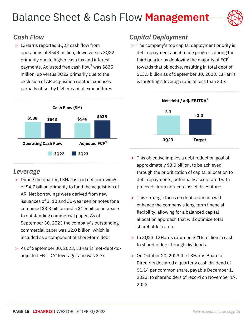 PAGE 15 | L3HARRIS INVESTOR LETTER 3Q 2023 Refer to endnotes on page 16 Capital Deployment > The company’s top capital deployment priority is debt repayment and it made progress during the third quarter by deploying the majority of FCF1 towards that objective, resulting in total debt of $13.5 billion as of September 30, 2023. L3Harris is targeting a leverage ratio of less than 3.0x > This objective implies a debt reduction goal of approximately $3.0 billion, to be achieved through the prioritization of capital allocation to debt repayments, potentially accelerated with proceeds from non-core asset divestitures > This strategic focus on debt reduction will enhance the company’s long-term financial flexibility, allowing for a balanced capital allocation approach that will optimize total shareholder return > In 3Q23, L3Harris returned $216 million in cash to shareholders through dividends > On October 20, 2023 the L3Harris Board of Directors declared a quarterly cash dividend of $1.14 per common share, payable December 1, 2023, to shareholders of record on November 17, 2023 Cash Flow > L3Harris reported 3Q23 cash flow from operations of $543 million, down versus 3Q22 primarily due to higher cash tax and interest payments. Adjusted free cash flow1 was $635 million, up versus 3Q22 primarily due to the exclusion of AR acquisition related expenses partially offset by higher capital expenditures Leverage > During the quarter, L3Harris had net borrowings of $4.7 billion primarily to fund the acquisition of AR. Net borrowings were derived from new issuances of 3, 10 and 30-year senior notes for a combined $3.3 billion and a $1.5 billion increase to outstanding commercial paper. As of September 30, 2023 the company’s outstanding commercial paper was $2.0 billion, which is included as a component of short-term debt > As of September 30, 2023, L3Harris’ net-debt-to- adjusted EBITDA1 leverage ratio was 3.7x Balance Sheet & Cash Flow Management Cash Flow ($M) $588 $546$543 $635 3Q22 3Q23 Operating Cash Flow Adjusted FCF1 Net-debt / adj. EBITDA 3.7 3.0 3Q23 Target < 1