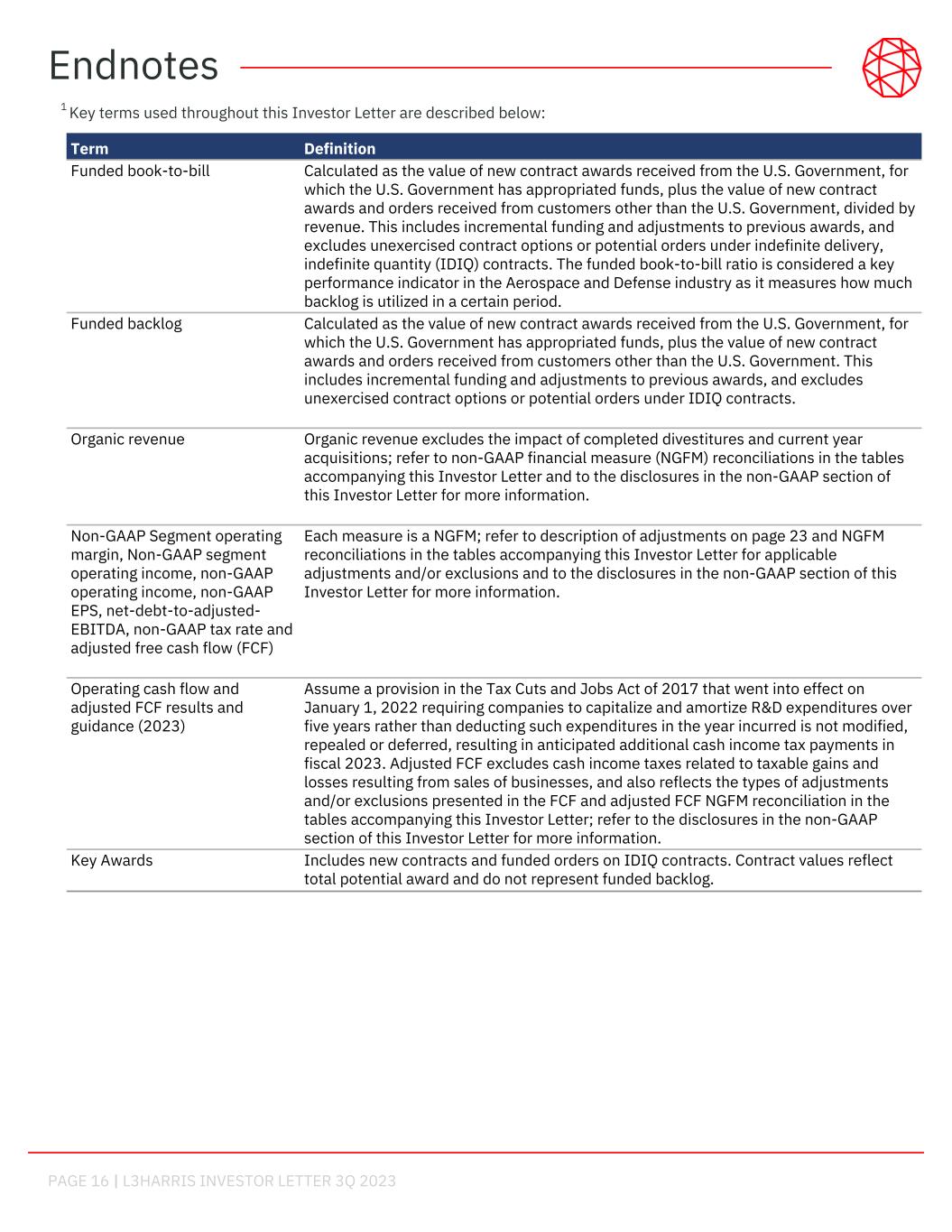 PAGE 16 | L3HARRIS INVESTOR LETTER 3Q 2023 1 Key terms used throughout this Investor Letter are described below: Term Definition Funded book-to-bill Calculated as the value of new contract awards received from the U.S. Government, for which the U.S. Government has appropriated funds, plus the value of new contract awards and orders received from customers other than the U.S. Government, divided by revenue. This includes incremental funding and adjustments to previous awards, and excludes unexercised contract options or potential orders under indefinite delivery, indefinite quantity (IDIQ) contracts. The funded book-to-bill ratio is considered a key performance indicator in the Aerospace and Defense industry as it measures how much backlog is utilized in a certain period. Funded backlog Calculated as the value of new contract awards received from the U.S. Government, for which the U.S. Government has appropriated funds, plus the value of new contract awards and orders received from customers other than the U.S. Government. This includes incremental funding and adjustments to previous awards, and excludes unexercised contract options or potential orders under IDIQ contracts. Organic revenue Organic revenue excludes the impact of completed divestitures and current year acquisitions; refer to non-GAAP financial measure (NGFM) reconciliations in the tables accompanying this Investor Letter and to the disclosures in the non-GAAP section of this Investor Letter for more information. Non-GAAP Segment operating margin, Non-GAAP segment operating income, non-GAAP operating income, non-GAAP EPS, net-debt-to-adjusted- EBITDA, non-GAAP tax rate and adjusted free cash flow (FCF) Each measure is a NGFM; refer to description of adjustments on page 23 and NGFM reconciliations in the tables accompanying this Investor Letter for applicable adjustments and/or exclusions and to the disclosures in the non-GAAP section of this Investor Letter for more information. Operating cash flow and adjusted FCF results and guidance (2023) Assume a provision in the Tax Cuts and Jobs Act of 2017 that went into effect on January 1, 2022 requiring companies to capitalize and amortize R&D expenditures over five years rather than deducting such expenditures in the year incurred is not modified, repealed or deferred, resulting in anticipated additional cash income tax payments in fiscal 2023. Adjusted FCF excludes cash income taxes related to taxable gains and losses resulting from sales of businesses, and also reflects the types of adjustments and/or exclusions presented in the FCF and adjusted FCF NGFM reconciliation in the tables accompanying this Investor Letter; refer to the disclosures in the non-GAAP section of this Investor Letter for more information. Key Awards Includes new contracts and funded orders on IDIQ contracts. Contract values reflect total potential award and do not represent funded backlog. Endnotes