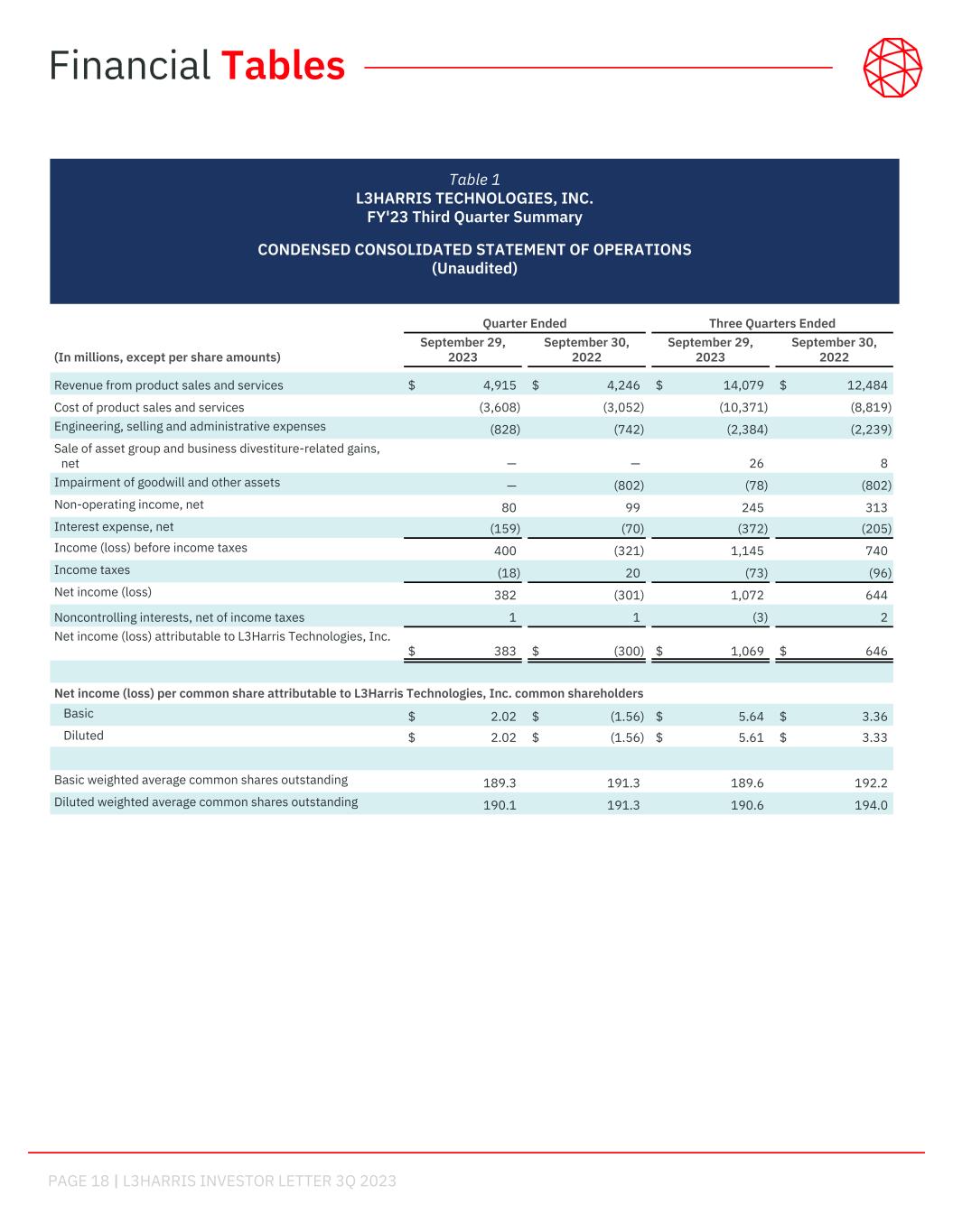 PAGE 18 | L3HARRIS INVESTOR LETTER 3Q 2023   Quarter Ended Three Quarters Ended (In millions, except per share amounts) September 29, 2023 September 30, 2022 September 29, 2023 September 30, 2022 Revenue from product sales and services $ 4,915 $ 4,246 $ 14,079 $ 12,484 Cost of product sales and services (3,608) (3,052) (10,371) (8,819) Engineering, selling and administrative expenses (828) (742) (2,384) (2,239) Sale of asset group and business divestiture-related gains, net — — 26 8 Impairment of goodwill and other assets — (802) (78) (802) Non-operating income, net 80 99 245 313 Interest expense, net (159) (70) (372) (205) Income (loss) before income taxes 400 (321) 1,145 740 Income taxes (18) 20 (73) (96) Net income (loss) 382 (301) 1,072 644 Noncontrolling interests, net of income taxes 1 1 (3) 2 Net income (loss) attributable to L3Harris Technologies, Inc. $ 383 $ (300) $ 1,069 $ 646 Net income (loss) per common share attributable to L3Harris Technologies, Inc. common shareholders Basic $ 2.02 $ (1.56) $ 5.64 $ 3.36 Diluted $ 2.02 $ (1.56) $ 5.61 $ 3.33 Basic weighted average common shares outstanding 189.3 191.3 189.6 192.2 Diluted weighted average common shares outstanding 190.1 191.3 190.6 194.0 Table 1 L3HARRIS TECHNOLOGIES, INC. FY'23 Third Quarter Summary CONDENSED CONSOLIDATED STATEMENT OF OPERATIONS (Unaudited) support Financial Tables
