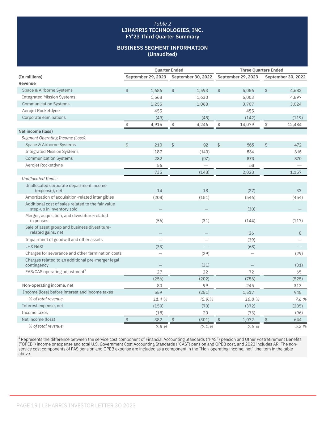 PAGE 19 | L3HARRIS INVESTOR LETTER 3Q 2023   Quarter Ended Three Quarters Ended (In millions) September 29, 2023 September 30, 2022 September 29, 2023 September 30, 2022 Revenue Space & Airborne Systems $ 1,686 $ 1,593 $ 5,056 $ 4,682 Integrated Mission Systems 1,568 1,630 5,003 4,897 Communication Systems 1,255 1,068 3,707 3,024 Aerojet Rocketdyne 455 — 455 — Corporate eliminations (49) (45) (142) (119) $ 4,915 $ 4,246 $ 14,079 $ 12,484 Net income (loss) Segment Operating Income (Loss): Space & Airborne Systems $ 210 $ 92 $ 565 $ 472 Integrated Mission Systems 187 (143) 534 315 Communication Systems 282 (97) 873 370 Aerojet Rocketdyne 56 — 56 — 735 (148) 2,028 1,157 Unallocated Items: Unallocated corporate department income (expense), net 14 18 (27) 33 Amortization of acquisition-related intangibles (208) (151) (546) (454) Additional cost of sales related to the fair value step-up in inventory sold — — (30) — Merger, acquisition, and divestiture-related expenses (56) (31) (144) (117) Sale of asset group and business divestiture- related gains, net — — 26 8 Impairment of goodwill and other assets — — (39) — LHX NeXt (33) — (68) — Charges for severance and other termination costs — (29) — (29) Charges related to an additional pre-merger legal contingency — (31) — (31) FAS/CAS operating adjustment1 27 22 72 65 (256) (202) (756) (525) Non-operating income, net 80 99 245 313 Income (loss) before interest and income taxes 559 (251) 1,517 945 % of total revenue 11.4 % (5.9) % 10.8 % 7.6 % Interest expense, net (159) (70) (372) (205) Income taxes (18) 20 (73) (96) Net income (loss) $ 382 $ (301) $ 1,072 $ 644 % of total revenue 7.8 % (7.1) % 7.6 % 5.2 % 1 Represents the difference between the service cost component of Financial Accounting Standards (“FAS”) pension and Other Postretirement Benefits (“OPEB”) income or expense and total U.S. Government Cost Accounting Standards (“CAS”) pension and OPEB cost, and 2023 includes AR. The non- service cost components of FAS pension and OPEB expense are included as a component in the “Non-operating income, net” line item in the table above. Table 2 L3HARRIS TECHNOLOGIES, INC. FY'23 Third Quarter Summary BUSINESS SEGMENT INFORMATION (Unaudited) support