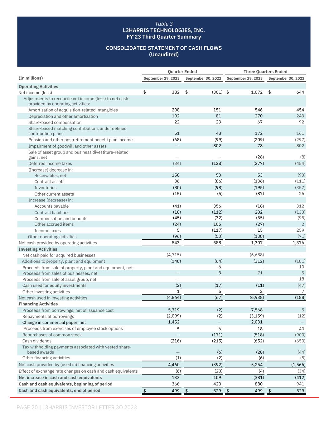 PAGE 20 | L3HARRIS INVESTOR LETTER 3Q 2023   Quarter Ended Three Quarters Ended (In millions) September 29, 2023 September 30, 2022 September 29, 2023 September 30, 2022 Operating Activities Net income (loss) $ 382 $ (301) $ 1,072 $ 644 Adjustments to reconcile net income (loss) to net cash provided by operating activities: Amortization of acquisition-related intangibles 208 151 546 454 Depreciation and other amortization 102 81 270 243 Share-based compensation 22 23 67 92 Share-based matching contributions under defined contribution plans 51 48 172 161 Pension and other postretirement benefit plan income (68) (99) (209) (297) Impairment of goodwill and other assets — 802 78 802 Sale of asset group and business divestiture-related gains, net — — (26) (8) Deferred income taxes (34) (128) (277) (454) (Increase) decrease in: Receivables, net 158 53 53 (93) Contract assets 36 (86) (136) (111) Inventories (80) (98) (195) (357) Other current assets (15) (5) (87) 26 Increase (decrease) in: Accounts payable (41) 356 (18) 312 Contract liabilities (18) (112) 202 (133) Compensation and benefits (45) (32) (55) (95) Other accrued items (24) 105 (27) 2 Income taxes 5 (117) 15 259 Other operating activities (96) (53) (138) (71) Net cash provided by operating activities 543 588 1,307 1,376 Investing Activities Net cash paid for acquired businesses (4,715) — (6,688) — Additions to property, plant and equipment (148) (64) (312) (181) Proceeds from sale of property, plant and equipment, net — 6 — 10 Proceeds from sales of businesses, net — 3 71 5 Proceeds from sale of asset group, net — — — 18 Cash used for equity investments (2) (17) (11) (47) Other investing activities 1 5 2 7 Net cash used in investing activities (4,864) (67) (6,938) (188) Financing Activities Proceeds from borrowings, net of issuance cost 5,319 (2) 7,568 5 Repayments of borrowings (2,099) (2) (3,159) (12) Change in commercial paper, net 1,452 — 2,031 — Proceeds from exercises of employee stock options 5 6 18 40 Repurchases of common stock — (171) (518) (900) Cash dividends (216) (215) (652) (650) Tax withholding payments associated with vested share- based awards — (6) (28) (44) Other financing activities (1) (2) (6) (5) Net cash provided by (used in) financing activities 4,460 (392) 5,254 (1,566) Effect of exchange rate changes on cash and cash equivalents (6) (20) (4) (34) Net increase in cash and cash equivalents 133 109 (381) (412) Cash and cash equivalents, beginning of period 366 420 880 941 Cash and cash equivalents, end of period $ 499 $ 529 $ 499 $ 529 Table 3 L3HARRIS TECHNOLOGIES, INC. FY'23 Third Quarter Summary CONSOLIDATED STATEMENT OF CASH FLOWS (Unaudited) support