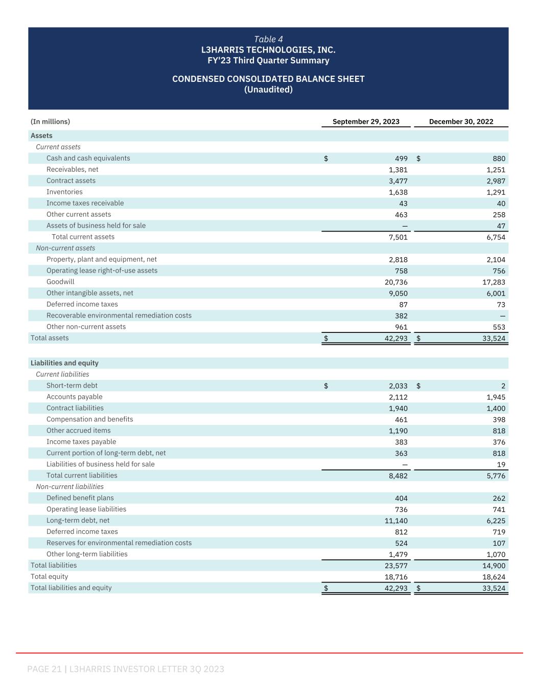PAGE 21 | L3HARRIS INVESTOR LETTER 3Q 2023 (In millions) September 29, 2023 December 30, 2022 Assets Current assets Cash and cash equivalents $ 499 $ 880 Receivables, net 1,381 1,251 Contract assets 3,477 2,987 Inventories 1,638 1,291 Income taxes receivable 43 40 Other current assets 463 258 Assets of business held for sale — 47 Total current assets 7,501 6,754 Non-current assets Property, plant and equipment, net 2,818 2,104 Operating lease right-of-use assets 758 756 Goodwill 20,736 17,283 Other intangible assets, net 9,050 6,001 Deferred income taxes 87 73 Recoverable environmental remediation costs 382 — Other non-current assets 961 553 Total assets $ 42,293 $ 33,524 Liabilities and equity Current liabilities Short-term debt $ 2,033 $ 2 Accounts payable 2,112 1,945 Contract liabilities 1,940 1,400 Compensation and benefits 461 398 Other accrued items 1,190 818 Income taxes payable 383 376 Current portion of long-term debt, net 363 818 Liabilities of business held for sale — 19 Total current liabilities 8,482 5,776 Non-current liabilities Defined benefit plans 404 262 Operating lease liabilities 736 741 Long-term debt, net 11,140 6,225 Deferred income taxes 812 719 Reserves for environmental remediation costs 524 107 Other long-term liabilities 1,479 1,070 Total liabilities 23,577 14,900 Total equity 18,716 18,624 Total liabilities and equity $ 42,293 $ 33,524 Table 4 L3HARRIS TECHNOLOGIES, INC. FY'23 Third Quarter Summary CONDENSED CONSOLIDATED BALANCE SHEET (Unaudited) support