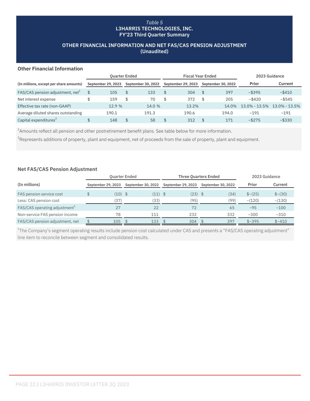PAGE 22 | L3HARRIS INVESTOR LETTER 3Q 2023 Net FAS/CAS Pension Adjustment Quarter Ended Three Quarters Ended 2023 Guidance (In millions) September 29, 2023 September 30, 2022 September 29, 2023 September 30, 2022 Prior Current FAS pension service cost $ (10) $ (11) $ (23) $ (34) $~(25) $~(30) Less: CAS pension cost (37) (33) (95) (99) ~(120) ~(130) FAS/CAS operating adjustment1 27 22 72 65 ~95 ~100 Non-service FAS pension income 78 111 232 332 ~300 ~310 FAS/CAS pension adjustment, net $ 105 $ 133 $ 304 $ 397 $~395 $~410 1The Company’s segment operating results include pension cost calculated under CAS and presents a “FAS/CAS operating adjustment” line item to reconcile between segment and consolidated results. Other Financial Information Quarter Ended Fiscal Year Ended 2023 Guidance (In millions, except per share amounts) September 29, 2023 September 30, 2022 September 29, 2023 September 30, 2022 Prior Current FAS/CAS pension adjustment, net1 $ 105 $ 133 $ 304 $ 397 ~$395 ~$410 Net interest expense $ 159 $ 70 $ 372 $ 205 ~$420 ~$545 Effective tax rate (non-GAAP) 12.9 % 14.0 % 13.2 % 14.0 % 13.0% - 13.5% 13.0% - 13.5% Average diluted shares outstanding 190.1 191.3 190.6 194.0 ~191 ~191 Capital expenditures2 $ 148 $ 58 $ 312 $ 171 ~$275 ~$330 1Amounts reflect all pension and other postretirement benefit plans. See table below for more information. 2Represents additions of property, plant and equipment, net of proceeds from the sale of property, plant and equipment. Table 5 L3HARRIS TECHNOLOGIES, INC. FY'23 Third Quarter Summary OTHER FINANCIAL INFORMATION AND NET FAS/CAS PENSION ADJUSTMENT (Unaudited) support