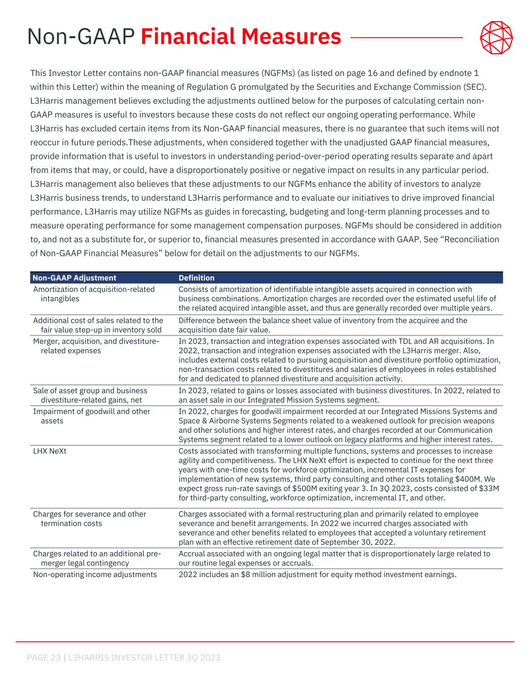 PAGE 23 | L3HARRIS INVESTOR LETTER 3Q 2023 Non-GAAP Adjustment Definition Amortization of acquisition-related intangibles Consists of amortization of identifiable intangible assets acquired in connection with business combinations. Amortization charges are recorded over the estimated useful life of the related acquired intangible asset, and thus are generally recorded over multiple years. Additional cost of sales related to the fair value step-up in inventory sold Difference between the balance sheet value of inventory from the acquiree and the acquisition date fair value. Merger, acquisition, and divestiture- related expenses In 2023, transaction and integration expenses associated with TDL and AR acquisitions. In 2022, transaction and integration expenses associated with the L3Harris merger. Also, includes external costs related to pursuing acquisition and divestiture portfolio optimization, non-transaction costs related to divestitures and salaries of employees in roles established for and dedicated to planned divestiture and acquisition activity. Sale of asset group and business divestiture-related gains, net In 2023, related to gains or losses associated with business divestitures. In 2022, related to an asset sale in our Integrated Mission Systems segment. Impairment of goodwill and other assets In 2022, charges for goodwill impairment recorded at our Integrated Missions Systems and Space & Airborne Systems Segments related to a weakened outlook for precision weapons and other solutions and higher interest rates, and charges recorded at our Communication Systems segment related to a lower outlook on legacy platforms and higher interest rates. LHX NeXt Costs associated with transforming multiple functions, systems and processes to increase agility and competitiveness. The LHX NeXt effort is expected to continue for the next three years with one-time costs for workforce optimization, incremental IT expenses for implementation of new systems, third party consulting and other costs totaling $400M. We expect gross run-rate savings of $500M exiting year 3. In 3Q 2023, costs consisted of $33M for third-party consulting, workforce optimization, incremental IT, and other. Charges for severance and other termination costs Charges associated with a formal restructuring plan and primarily related to employee severance and benefit arrangements. In 2022 we incurred charges associated with severance and other benefits related to employees that accepted a voluntary retirement plan with an effective retirement date of September 30, 2022. Charges related to an additional pre- merger legal contingency Accrual associated with an ongoing legal matter that is disproportionately large related to our routine legal expenses or accruals. Non-operating income adjustments 2022 includes an $8 million adjustment for equity method investment earnings. This Investor Letter contains non-GAAP financial measures (NGFMs) (as listed on page 16 and defined by endnote 1 within this Letter) within the meaning of Regulation G promulgated by the Securities and Exchange Commission (SEC). L3Harris management believes excluding the adjustments outlined below for the purposes of calculating certain non- GAAP measures is useful to investors because these costs do not reflect our ongoing operating performance. While L3Harris has excluded certain items from its Non-GAAP financial measures, there is no guarantee that such items will not reoccur in future periods.These adjustments, when considered together with the unadjusted GAAP financial measures, provide information that is useful to investors in understanding period-over-period operating results separate and apart from items that may, or could, have a disproportionately positive or negative impact on results in any particular period. L3Harris management also believes that these adjustments to our NGFMs enhance the ability of investors to analyze L3Harris business trends, to understand L3Harris performance and to evaluate our initiatives to drive improved financial performance. L3Harris may utilize NGFMs as guides in forecasting, budgeting and long-term planning processes and to measure operating performance for some management compensation purposes. NGFMs should be considered in addition to, and not as a substitute for, or superior to, financial measures presented in accordance with GAAP. See “Reconciliation of Non-GAAP Financial Measures” below for detail on the adjustments to our NGFMs. Non-GAAP Financial Measures