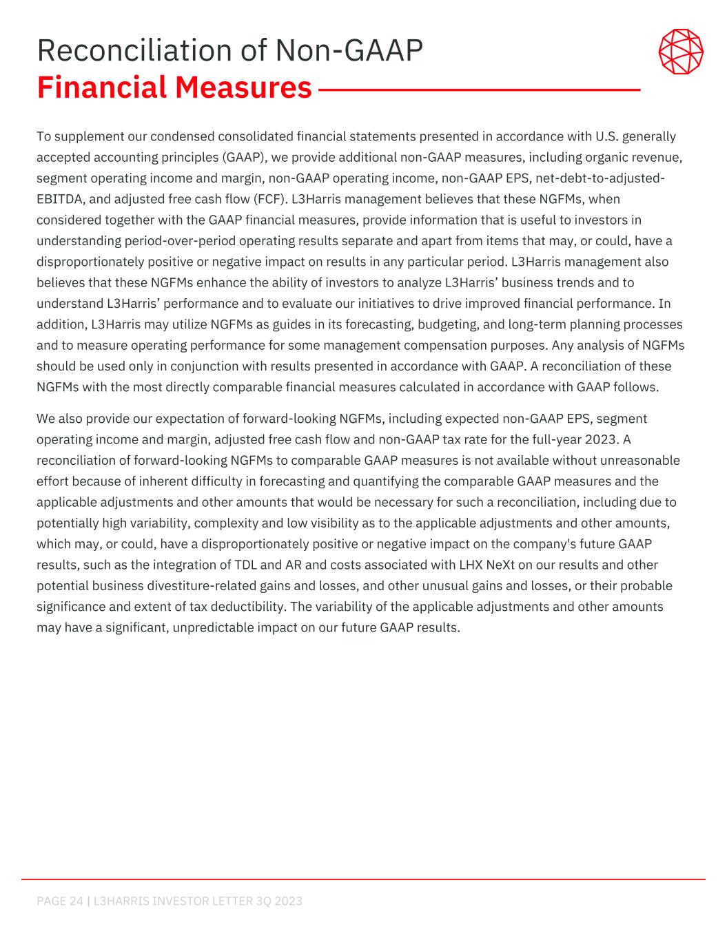 PAGE 24 | L3HARRIS INVESTOR LETTER 3Q 2023 To supplement our condensed consolidated financial statements presented in accordance with U.S. generally accepted accounting principles (GAAP), we provide additional non-GAAP measures, including organic revenue, segment operating income and margin, non-GAAP operating income, non-GAAP EPS, net-debt-to-adjusted- EBITDA, and adjusted free cash flow (FCF). L3Harris management believes that these NGFMs, when considered together with the GAAP financial measures, provide information that is useful to investors in understanding period-over-period operating results separate and apart from items that may, or could, have a disproportionately positive or negative impact on results in any particular period. L3Harris management also believes that these NGFMs enhance the ability of investors to analyze L3Harris’ business trends and to understand L3Harris’ performance and to evaluate our initiatives to drive improved financial performance. In addition, L3Harris may utilize NGFMs as guides in its forecasting, budgeting, and long-term planning processes and to measure operating performance for some management compensation purposes. Any analysis of NGFMs should be used only in conjunction with results presented in accordance with GAAP. A reconciliation of these NGFMs with the most directly comparable financial measures calculated in accordance with GAAP follows. We also provide our expectation of forward-looking NGFMs, including expected non-GAAP EPS, segment operating income and margin, adjusted free cash flow and non-GAAP tax rate for the full-year 2023. A reconciliation of forward-looking NGFMs to comparable GAAP measures is not available without unreasonable effort because of inherent difficulty in forecasting and quantifying the comparable GAAP measures and the applicable adjustments and other amounts that would be necessary for such a reconciliation, including due to potentially high variability, complexity and low visibility as to the applicable adjustments and other amounts, which may, or could, have a disproportionately positive or negative impact on the company's future GAAP results, such as the integration of TDL and AR and costs associated with LHX NeXt on our results and other potential business divestiture-related gains and losses, and other unusual gains and losses, or their probable significance and extent of tax deductibility. The variability of the applicable adjustments and other amounts may have a significant, unpredictable impact on our future GAAP results. Reconciliation of Non-GAAP Financial Measures