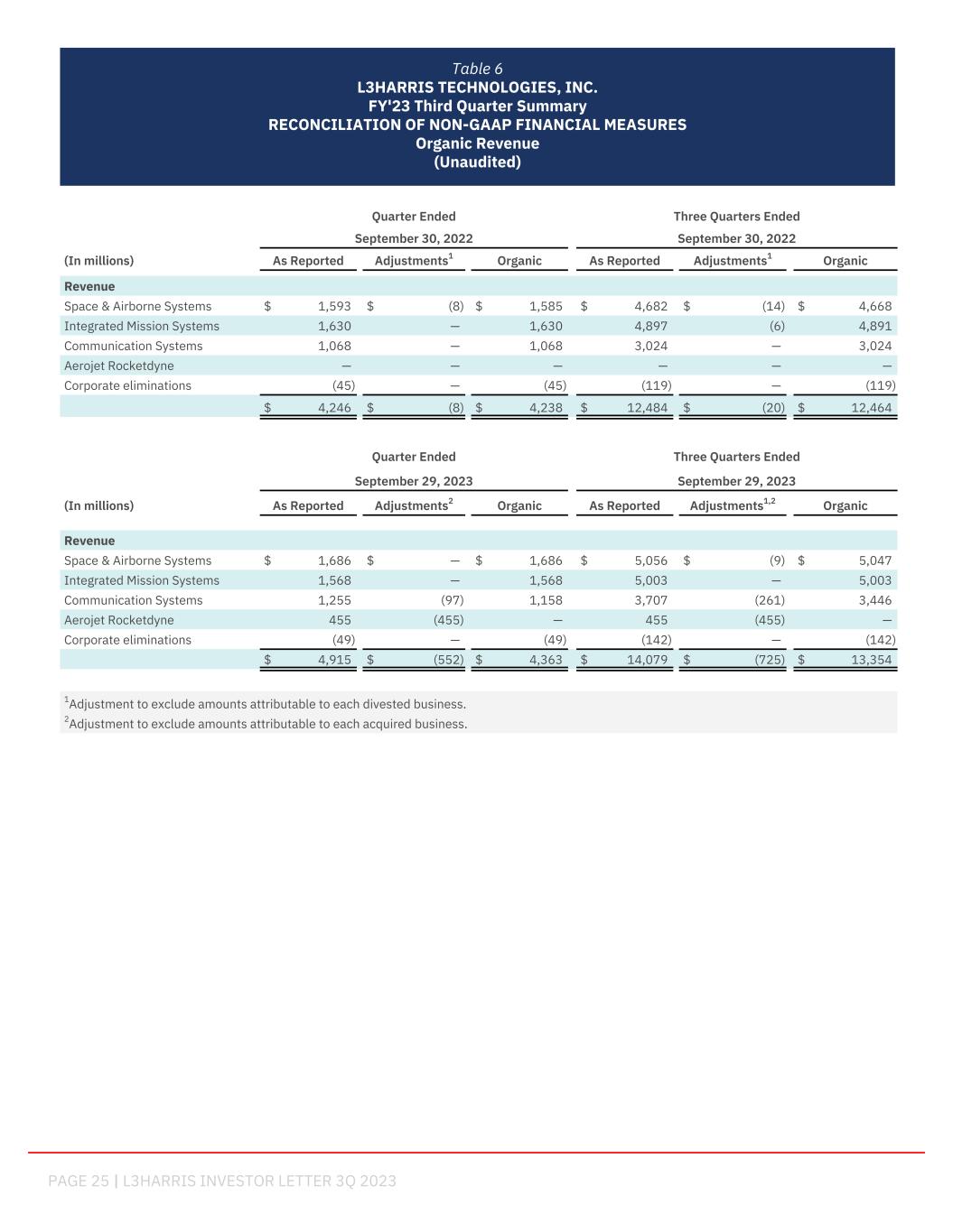 PAGE 25 | L3HARRIS INVESTOR LETTER 3Q 2023 Table 6 L3HARRIS TECHNOLOGIES, INC. FY'23 Third Quarter Summary RECONCILIATION OF NON-GAAP FINANCIAL MEASURES Organic Revenue (Unaudited) Quarter Ended Three Quarters Ended September 30, 2022 September 30, 2022 (In millions) As Reported Adjustments1 Organic As Reported Adjustments1 Organic Revenue Space & Airborne Systems $ 1,593 $ (8) $ 1,585 $ 4,682 $ (14) $ 4,668 Integrated Mission Systems 1,630 — 1,630 4,897 (6) 4,891 Communication Systems 1,068 — 1,068 3,024 — 3,024 Aerojet Rocketdyne — — — — — — Corporate eliminations (45) — (45) (119) — (119) $ 4,246 $ (8) $ 4,238 $ 12,484 $ (20) $ 12,464 Quarter Ended Three Quarters Ended September 29, 2023 September 29, 2023 (In millions) As Reported Adjustments2 Organic As Reported Adjustments1,2 Organic Revenue Space & Airborne Systems $ 1,686 $ — $ 1,686 $ 5,056 $ (9) $ 5,047 Integrated Mission Systems 1,568 — 1,568 5,003 — 5,003 Communication Systems 1,255 (97) 1,158 3,707 (261) 3,446 Aerojet Rocketdyne 455 (455) — 455 (455) — Corporate eliminations (49) — (49) (142) — (142) $ 4,915 $ (552) $ 4,363 $ 14,079 $ (725) $ 13,354 1Adjustment to exclude amounts attributable to each divested business. 2Adjustment to exclude amounts attributable to each acquired business. support