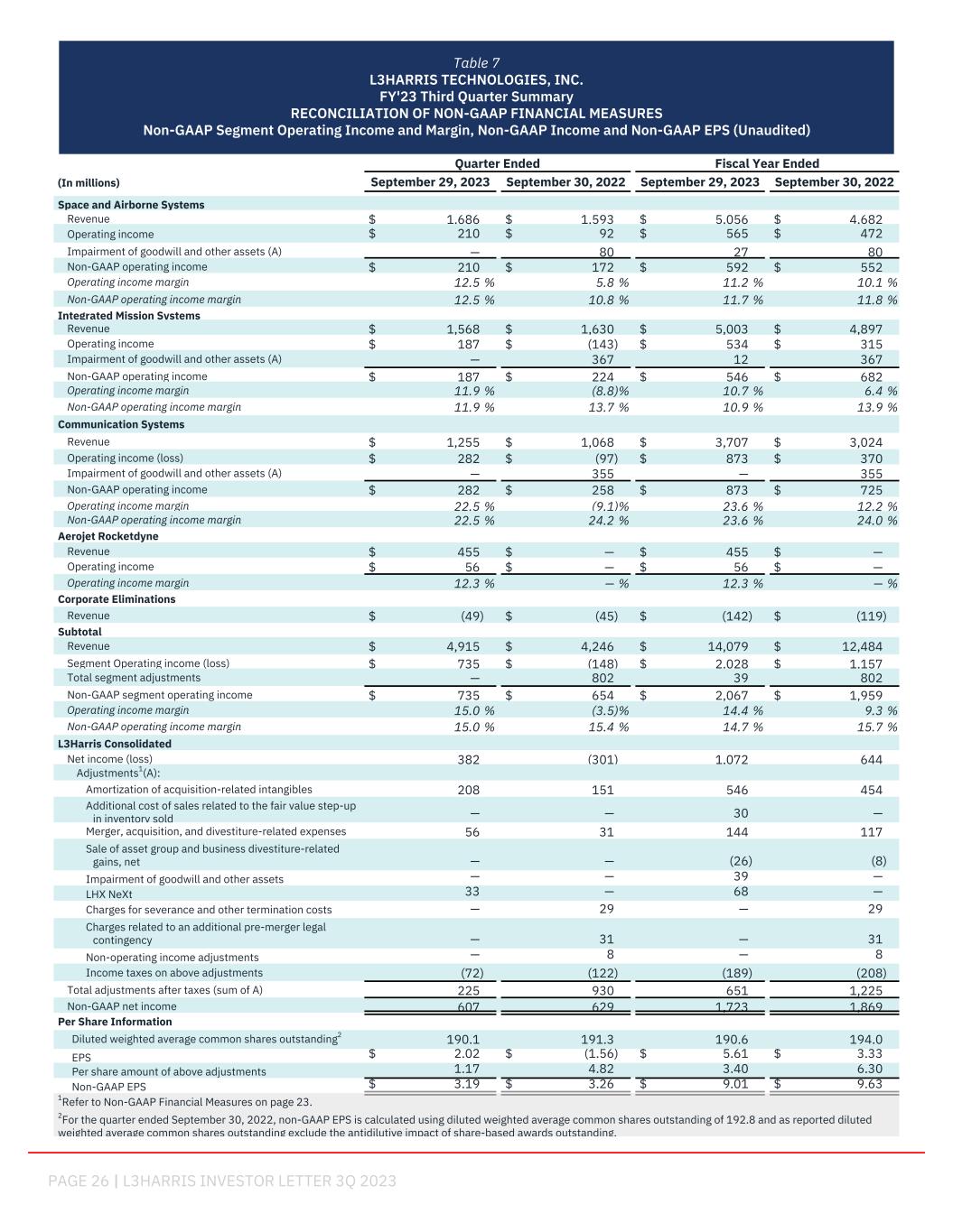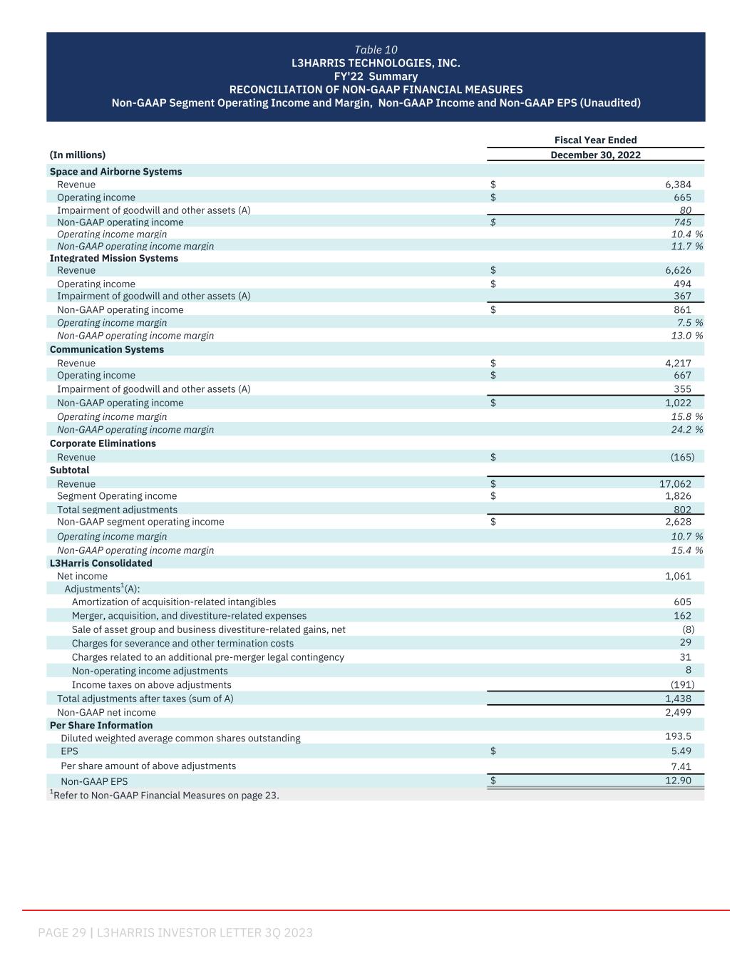 PAGE 29 | L3HARRIS INVESTOR LETTER 3Q 2023 Fiscal Year Ended (In millions) December 30, 2022 Space and Airborne Systems Revenue $ 6,384 Operating income $ 665 Impairment of goodwill and other assets (A) 80 Non-GAAP operating income $ 745 Operating income margin 10.4 % Non-GAAP operating income margin 11.7 % Integrated Mission Systems Revenue $ 6,626 Operating income $ 494 Impairment of goodwill and other assets (A) 367 Non-GAAP operating income $ 861 Operating income margin 7.5 % Non-GAAP operating income margin 13.0 % Communication Systems Revenue $ 4,217 Operating income $ 667 Impairment of goodwill and other assets (A) 355 Non-GAAP operating income $ 1,022 Operating income margin 15.8 % Non-GAAP operating income margin 24.2 % Corporate Eliminations Revenue $ (165) Subtotal Revenue $ 17,062 Segment Operating income $ 1,826 Total segment adjustments 802 Non-GAAP segment operating income $ 2,628 Operating income margin 10.7 % Non-GAAP operating income margin 15.4 % L3Harris Consolidated Net income 1,061 Adjustments1(A): Amortization of acquisition-related intangibles 605 Merger, acquisition, and divestiture-related expenses 162 Sale of asset group and business divestiture-related gains, net (8) Charges for severance and other termination costs 29 Charges related to an additional pre-merger legal contingency 31 Non-operating income adjustments 8 Income taxes on above adjustments (191) Total adjustments after taxes (sum of A) 1,438 Non-GAAP net income 2,499 Per Share Information Diluted weighted average common shares outstanding 193.5 EPS $ 5.49 Per share amount of above adjustments 7.41 Non-GAAP EPS $ 12.90 1Refer to Non-GAAP Financial Measures on page 23. Table 10 L3HARRIS TECHNOLOGIES, INC. FY'22 Summary RECONCILIATION OF NON-GAAP FINANCIAL MEASURES Non-GAAP Segment Operating Income and Margin, Non-GAAP Income and Non-GAAP EPS (Unaudited)