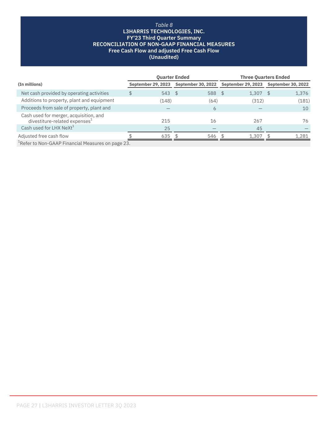 PAGE 27 | L3HARRIS INVESTOR LETTER 3Q 2023 Table 8 L3HARRIS TECHNOLOGIES, INC. FY'23 Third Quarter Summary RECONCILIATION OF NON-GAAP FINANCIAL MEASURES Free Cash Flow and adjusted Free Cash Flow (Unaudited) Quarter Ended Three Quarters Ended (In millions) September 29, 2023 September 30, 2022 September 29, 2023 September 30, 2022 Net cash provided by operating activities $ 543 $ 588 $ 1,307 $ 1,376 Additions to property, plant and equipment (148) (64) (312) (181) Proceeds from sale of property, plant and equipment, net — 6 — 10 Cash used for merger, acquisition, and divestiture-related expenses1 215 16 267 76 Cash used for LHX NeXt1 25 — 45 — Adjusted free cash flow $ 635 $ 546 $ 1,307 $ 1,281 1Refer to Non-GAAP Financial Measures on page 23. support
