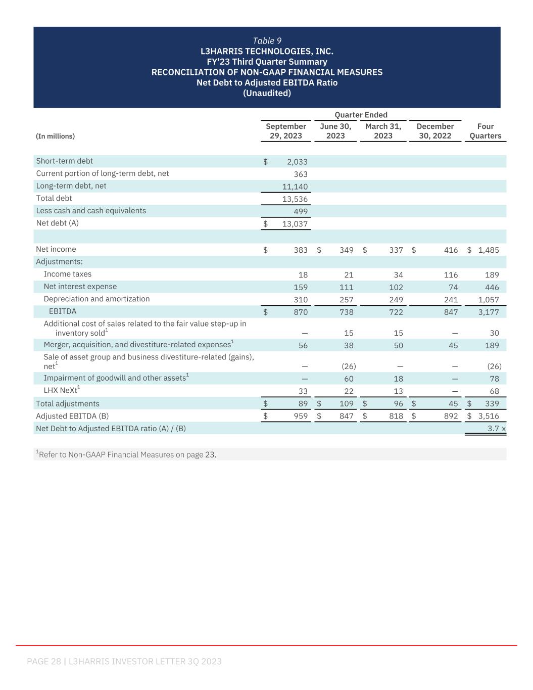 PAGE 28 | L3HARRIS INVESTOR LETTER 3Q 2023 Quarter Ended (In millions) September 29, 2023 June 30, 2023 March 31, 2023 December 30, 2022 Four Quarters Short-term debt $ 2,033 Current portion of long-term debt, net 363 Long-term debt, net 11,140 Total debt 13,536 Less cash and cash equivalents 499 Net debt (A) $ 13,037 Net income $ 383 $ 349 $ 337 $ 416 $ 1,485 Adjustments: Income taxes 18 21 34 116 189 Net interest expense 159 111 102 74 446 Depreciation and amortization 310 257 249 241 1,057 EBITDA $ 870 738 722 847 3,177 Additional cost of sales related to the fair value step-up in inventory sold1 — 15 15 — 30 Merger, acquisition, and divestiture-related expenses1 56 38 50 45 189 Sale of asset group and business divestiture-related (gains), net1 — (26) — — (26) Impairment of goodwill and other assets1 — 60 18 — 78 LHX NeXt1 33 22 13 — 68 Total adjustments $ 89 $ 109 $ 96 $ 45 $ 339 Adjusted EBITDA (B) $ 959 $ 847 $ 818 $ 892 $ 3,516 Net Debt to Adjusted EBITDA ratio (A) / (B) 3.7 x 1Refer to Non-GAAP Financial Measures on page 23. Table 9 L3HARRIS TECHNOLOGIES, INC. FY'23 Third Quarter Summary RECONCILIATION OF NON-GAAP FINANCIAL MEASURES Net Debt to Adjusted EBITDA Ratio (Unaudited)
