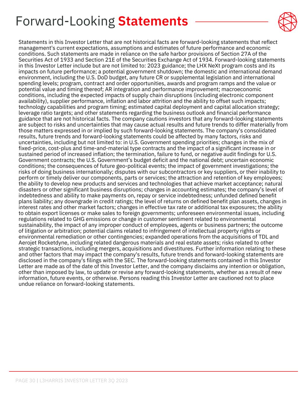 PAGE 30 | L3HARRIS INVESTOR LETTER 3Q 2023 Statements in this Investor Letter that are not historical facts are forward-looking statements that reflect management's current expectations, assumptions and estimates of future performance and economic conditions. Such statements are made in reliance on the safe harbor provisions of Section 27A of the Securities Act of 1933 and Section 21E of the Securities Exchange Act of 1934. Forward-looking statements in this Investor Letter include but are not limited to: 2023 guidance; the LHX NeXt program costs and its impacts on future performance; a potential government shutdown; the domestic and international demand environment, including the U.S. DoD budget, any future CR or supplemental legislation and international spending levels; program, contract and order opportunities, awards and program ramps and the value or potential value and timing thereof; AR integration and performance improvement; macroeconomic conditions, including the expected impacts of supply chain disruptions (including electronic component availability), supplier performance, inflation and labor attrition and the ability to offset such impacts; technology capabilities and program timing; estimated capital deployment and capital allocation strategy; leverage ratio targets; and other statements regarding the business outlook and financial performance guidance that are not historical facts. The company cautions investors that any forward-looking statements are subject to risks and uncertainties that may cause actual results and future trends to differ materially from those matters expressed in or implied by such forward-looking statements. The company's consolidated results, future trends and forward-looking statements could be affected by many factors, risks and uncertainties, including but not limited to: in U.S. Government spending priorities; changes in the mix of fixed-price, cost-plus and time-and-material type contracts and the impact of a significant increase in or sustained period of increased inflation; the termination, failure to fund, or negative audit findings for U.S. Government contracts; the U.S. Government’s budget deficit and the national debt; uncertain economic conditions; the consequences of future geo-political events; the impact of government investigations; the risks of doing business internationally; disputes with our subcontractors or key suppliers, or their inability to perform or timely deliver our components, parts or services; the attraction and retention of key employees; the ability to develop new products and services and technologies that achieve market acceptance; natural disasters or other significant business disruptions; changes in accounting estimates; the company’s level of indebtedness and ability to make payments on, repay or service indebtedness; unfunded defined benefit plans liability; any downgrade in credit ratings; the level of returns on defined benefit plan assets, changes in interest rates and other market factors; changes in effective tax rate or additional tax exposures; the ability to obtain export licenses or make sales to foreign governments; unforeseen environmental issues, including regulations related to GHG emissions or change in customer sentiment related to environmental sustainability, the impact of any improper conduct of employees, agents or business partners; the outcome of litigation or arbitration; potential claims related to infringement of intellectual property rights or environmental remediation or other contingencies; expanded operations from the acquisitions of TDL and Aerojet Rocketdyne, including related dangerous materials and real estate assets; risks related to other strategic transactions, including mergers, acquisitions and divestitures. Further information relating to these and other factors that may impact the company's results, future trends and forward-looking statements are disclosed in the company's filings with the SEC. The forward-looking statements contained in this Investor Letter are made as of the date of this Investor Letter, and the company disclaims any intention or obligation, other than imposed by law, to update or revise any forward-looking statements, whether as a result of new information, future events, or otherwise. Persons reading this Investor Letter are cautioned not to place undue reliance on forward-looking statements. Forward-Looking Statements