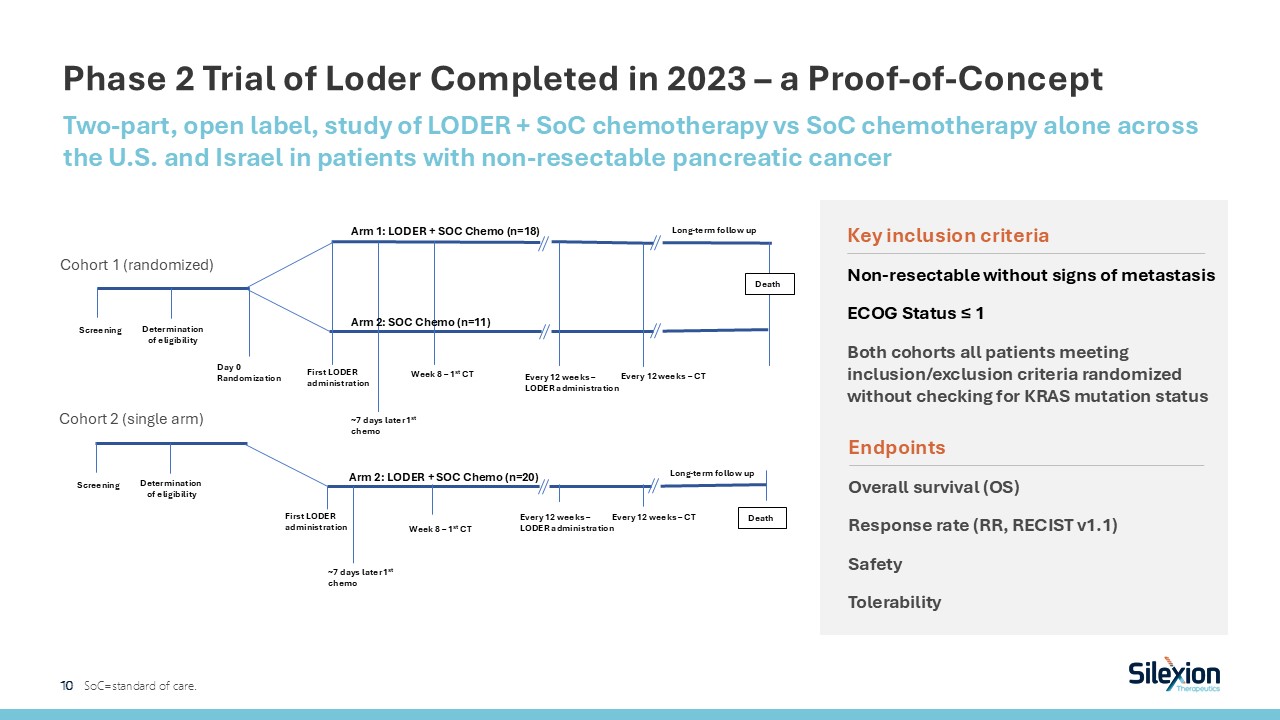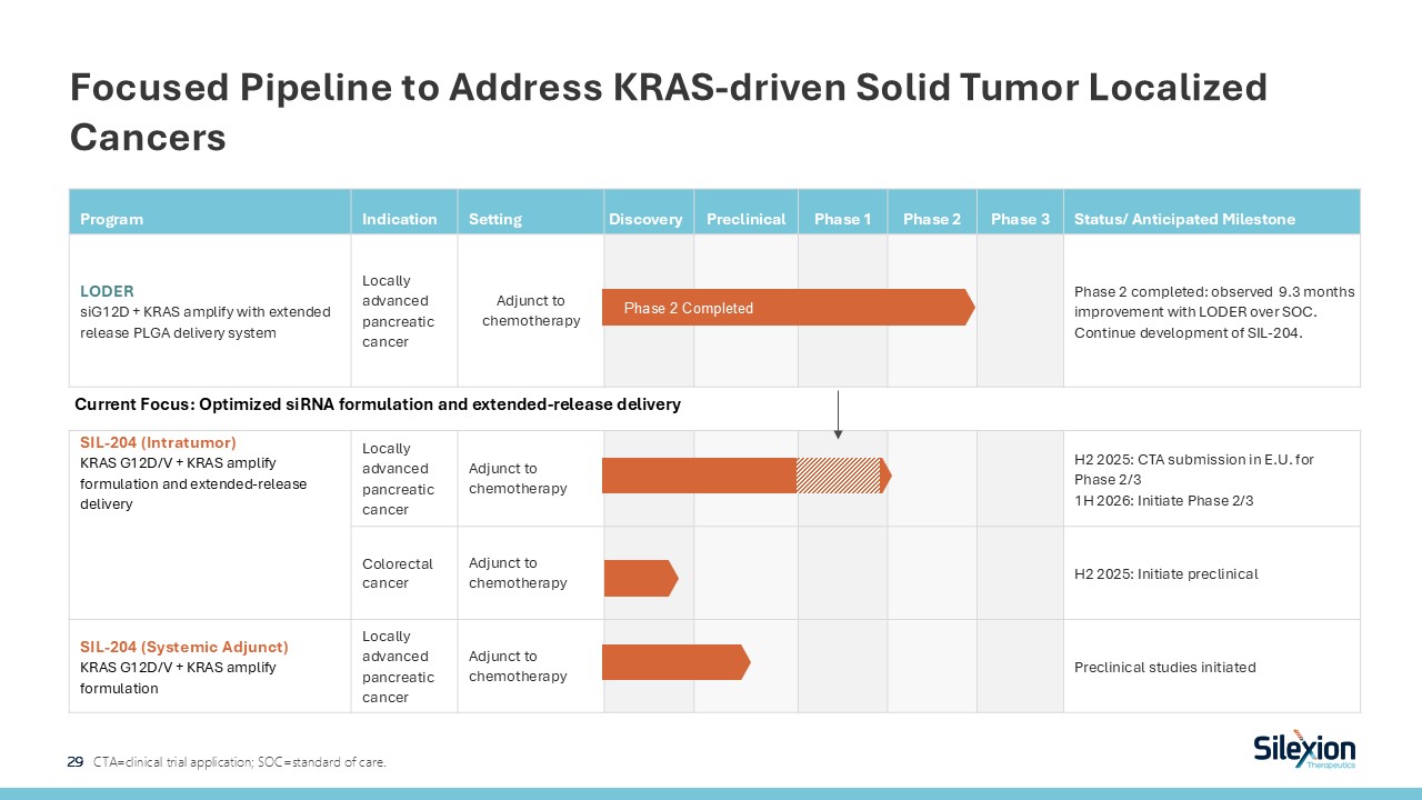 Program  Indication   Setting  Discovery  Preclinical  Phase 1  Phase 2  Phase 3  Status/ Anticipated Milestone  LODER  siG12D + KRAS amplify with extended release PLGA delivery system  Locally advanced pancreatic cancer  Adjunct to chemotherapy  Phase 2 completed: observed 9.3 months improvement with LODER over SOC.  Continue development of SIL-204.  SIL-204 (Intratumor)  KRAS G12D/V + KRAS amplify formulation and extended-release delivery   Locally advanced pancreatic cancer  Adjunct to chemotherapy  H2 2025: CTA submission in E.U. for Phase 2/31H 2026: Initiate Phase 2/3  Colorectal cancer  Adjunct to chemotherapy  H2 2025: Initiate preclinical  SIL-204 (Systemic Adjunct)  KRAS G12D/V + KRAS amplify formulation  Locally advanced pancreatic cancer  Adjunct to chemotherapy   Preclinical studies initiated  Focused Pipeline to Address KRAS-driven Solid Tumor Localized Cancers  29   CTA=clinical trial application; SOC=standard of care.  Phase 2 Completed   Current Focus: Optimized siRNA formulation and extended-release delivery