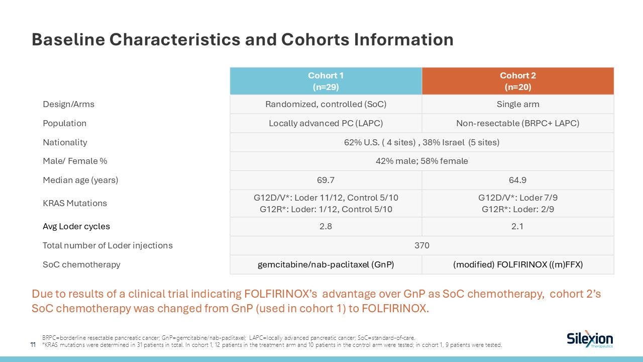 Baseline Characteristics and Cohorts Information  Due to results of a clinical trial indicating FOLFIRINOX’s advantage over GnP as SoC chemotherapy, cohort 2’s SoC chemotherapy was changed from GnP (used in cohort 1) to FOLFIRINOX.   BRPC=borderline resectable pancreatic cancer; GnP=gemcitabine/nab-paclitaxel; LAPC=locally advanced pancreatic cancer; SoC=standard-of-care.  *KRAS mutations were determined in 31 patients in total. In cohort 1, 12 patients in the treatment arm and 10 patients in the control arm were tested; in cohort 1, 9 patients were tested.  Cohort 1  (n=29)  Cohort 2  (n=20)  Design/Arms  Randomized, controlled (SoC)  Single arm  Population  Locally advanced PC (LAPC)  Non-resectable (BRPC+ LAPC)   Nationality   62% U.S. ( 4 sites) , 38% Israel (5 sites)  Male/ Female %  42% male; 58% female  Median age (years)  69.7   64.9  KRAS Mutations  G12D/V*: Loder 11/12, Control 5/10  G12R*: Loder: 1/12, Control 5/10  G12D/V*: Loder 7/9  G12R*: Loder: 2/9  Avg Loder cycles  2.8  2.1  Total number of Loder injections  370  SoC chemotherapy  gemcitabine/nab-paclitaxel (GnP)   (modified) FOLFIRINOX ((m)FFX)   11