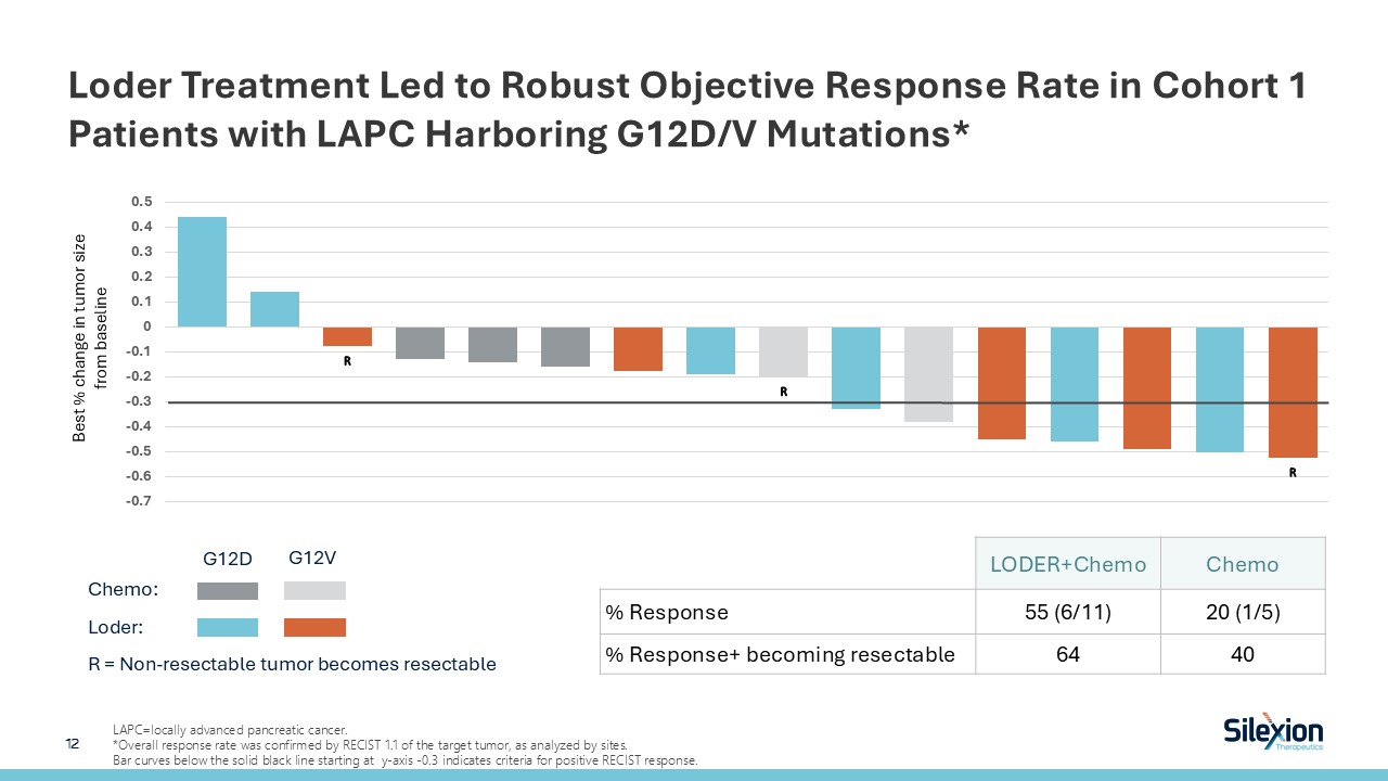 Loder Treatment Led to Robust Objective Response Rate in Cohort 1 Patients with LAPC Harboring G12D/V Mutations*  12   LAPC=locally advanced pancreatic cancer.  *Overall response rate was confirmed by RECIST 1.1 of the target tumor, as analyzed by sites.  Bar curves below the solid black line starting at y-axis -0.3 indicates criteria for positive RECIST response.  Chemo:  Loder:  R = Non-resectable tumor becomes resectable  G12D  G12V  LODER+Chemo  Chemo   % Response  55 (6/11)  20 (1/5)   % Response+ becoming resectable   64  40