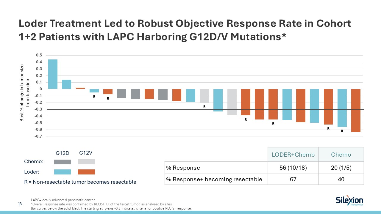Loder Treatment Led to Robust Objective Response Rate in Cohort 1+2 Patients with LAPC Harboring G12D/V Mutations*  13   LAPC=locally advanced pancreatic cancer.  *Overall response rate was confirmed by RECIST 1.1 of the target tumor, as analyzed by sites.  Bar curves below the solid black line starting at y-axis -0.3 indicates criteria for positive RECIST response.  Chemo:  Loder:  R = Non-resectable tumor becomes resectable  G12D  G12V  LODER+Chemo  Chemo   % Response  56 (10/18)  20 (1/5)   % Response+ becoming resectable   67  40