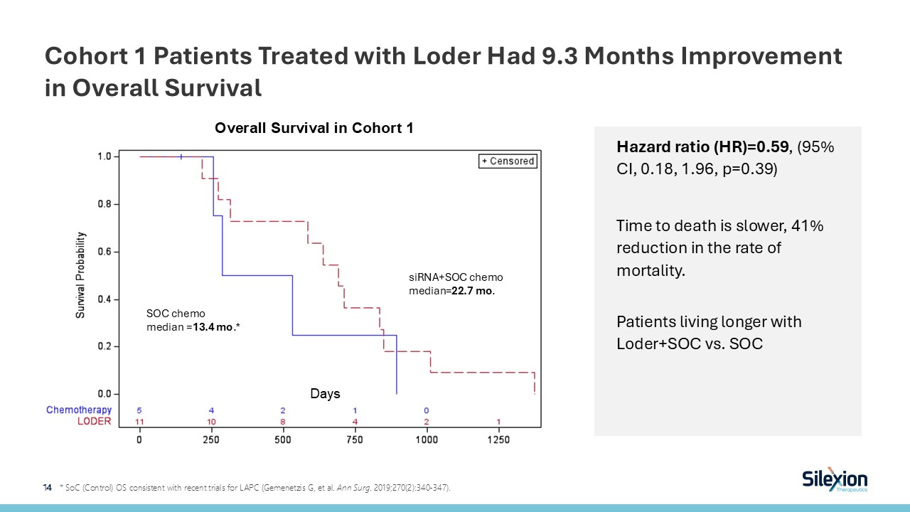 Cohort 1 Patients Treated with Loder Had 9.3 Months Improvement in Overall Survival  14   * SoC (Control) OS consistent with recent trials for LAPC (Gemenetzis G, et al. Ann Surg. 2019;270(2):340-347).  Hazard ratio (HR)=0.59, (95% CI, 0.18, 1.96, p=0.39)  Time to death is slower, 41% reduction in the rate of mortality.  Patients living longer with Loder+SOC vs. SOC  Days  Overall Survival in Cohort 1  SOC chemo median =13.4 mo.*  siRNA+SOC chemo median=22.7 mo.