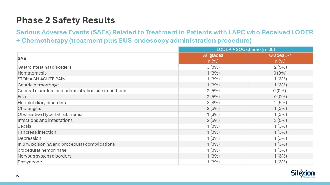 Phase 2 Safety Results  Serious Adverse Events (SAEs) Related to Treatment in Patients with LAPC who Received LODER + Chemotherapy (treatment plus EUS-endoscopy administration procedure)     LODER + SOC chemo (n=38)  SAE  All grades  n (%)  Grades 3-4  n (%)  Gastrointestinal disorders  3 (8%)  2 (5%)  Hematemesis  1 (3%)  0 (0%)   STOMACH ACUTE PAIN  1 (3%)  1 (3%)  Gastric hemorrhage  1 (3%)  1 (3%)  General disorders and administration site conditions  2 (5%)  0 (0%)    Fever  2 (5%)   0 (0%)   Hepatobiliary disorders  3 (8%)  2 (5%)  Cholangitis  2 (5%)  1 (3%)  Obstructive Hyperbilirubinemia  1 (3%)  1 (3%)  Infections and infestations  2 (5%)  2 (5%)  Sepsis  1 (3%)  1 (3%)  Pancreas infection   1 (3%)  1 (3%)  Depression  1 (3%)  1 (3%)  Injury, poisoning and procedural complications  1 (3%)  1 (3%)  procedural hemorrhage  1 (3%)  1 (3%)  Nervous system disorders  1 (3%)  1 (3%)  Presyncope   1 (3%)  1 (3%)  15