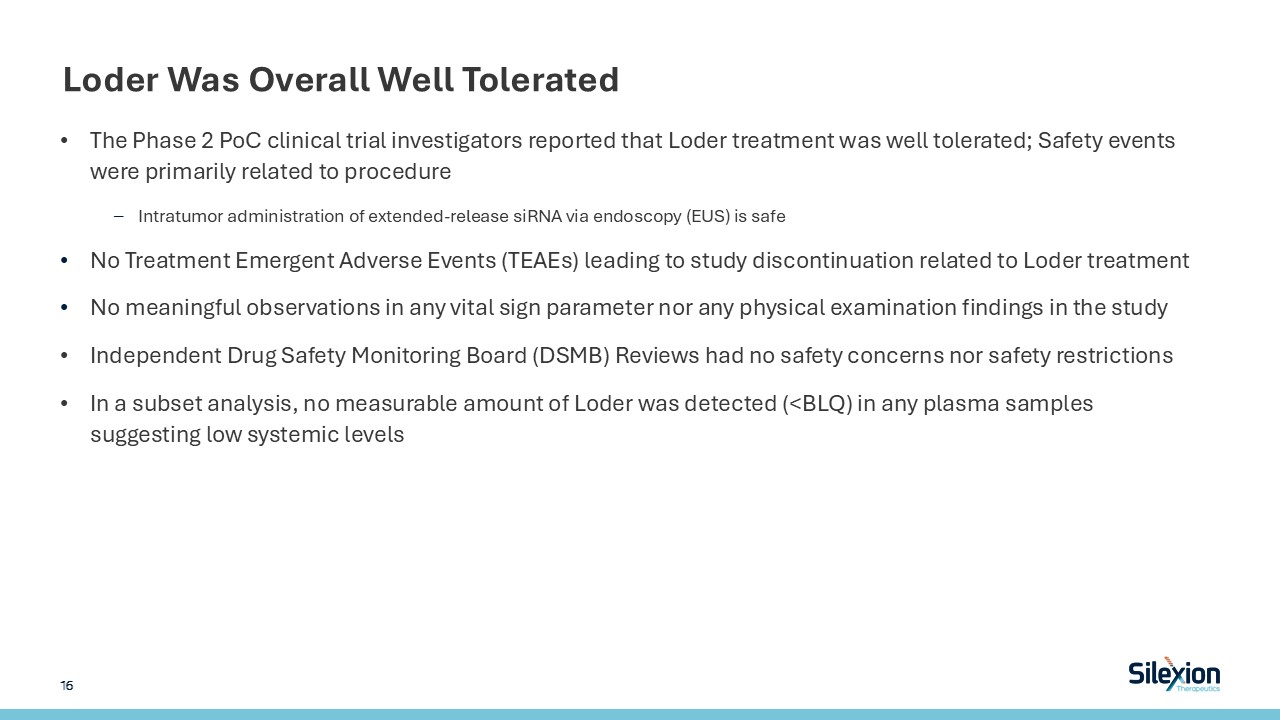 Loder Was Overall Well Tolerated  The Phase 2 PoC clinical trial investigators reported that Loder treatment was well tolerated; Safety events were primarily related to procedure  Intratumor administration of extended-release siRNA via endoscopy (EUS) is safe  No Treatment Emergent Adverse Events (TEAEs) leading to study discontinuation related to Loder treatment   No meaningful observations in any vital sign parameter nor any physical examination findings in the study   Independent Drug Safety Monitoring Board (DSMB) Reviews had no safety concerns nor safety restrictions  In a subset analysis, no measurable amount of Loder was detected (<BLQ) in any plasma samples suggesting low systemic levels  16