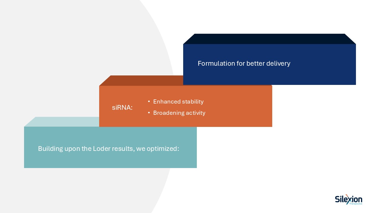 Building upon the Loder results, we optimized:  siRNA:  Formulation for better delivery  Enhanced stability  Broadening activity