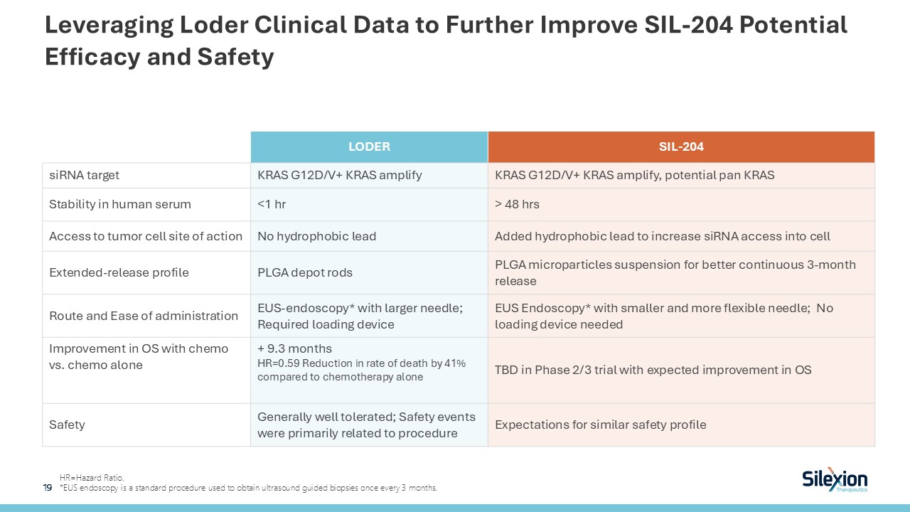Leveraging Loder Clinical Data to Further Improve SIL-204 Potential Efficacy and Safety  HR=Hazard Ratio.  *EUS endoscopy is a standard procedure used to obtain ultrasound guided biopsies once every 3 months.  `  LODER  SIL-204  siRNA target  KRAS G12D/V+ KRAS amplify  KRAS G12D/V+ KRAS amplify, potential pan KRAS  Stability in human serum   <1 hr  > 48 hrs  Access to tumor cell site of action  No hydrophobic lead  Added hydrophobic lead to increase siRNA access into cell  Extended-release profile  PLGA depot rods  PLGA microparticles suspension for better continuous 3-month release  Route and Ease of administration  EUS-endoscopy* with larger needle; Required loading device  EUS Endoscopy* with smaller and more flexible needle; No loading device needed  Improvement in OS with chemo vs. chemo alone  + 9.3 monthsHR=0.59 Reduction in rate of death by 41% compared to chemotherapy alone  TBD in Phase 2/3 trial with expected improvement in OS  Safety  Generally well tolerated; Safety events were primarily related to procedure  Expectations for similar safety profile  19