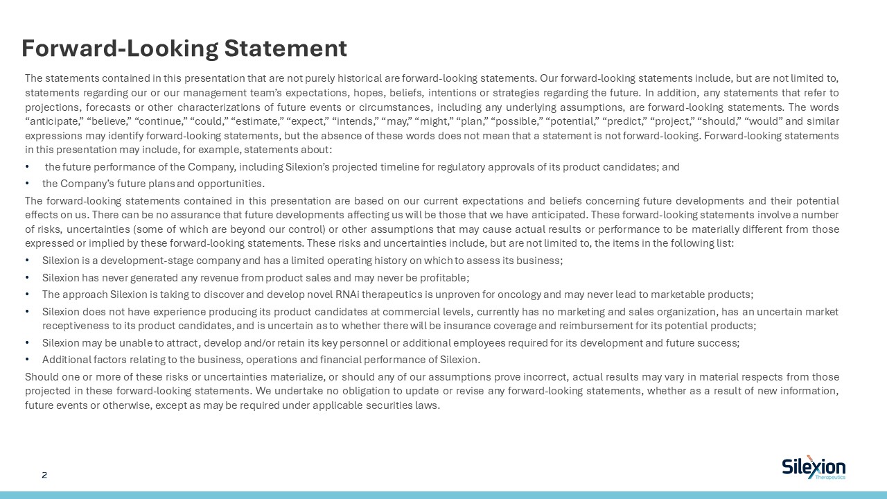 The statements contained in this presentation that are not purely historical are forward-looking statements. Our forward-looking statements include, but are not limited to, statements regarding our or our management team’s expectations, hopes, beliefs, intentions or strategies regarding the future. In addition, any statements that refer to projections, forecasts or other characterizations of future events or circumstances, including any underlying assumptions, are forward-looking statements. The words “anticipate,” “believe,” “continue,” “could,” “estimate,” “expect,” “intends,” “may,” “might,” “plan,” “possible,” “potential,” “predict,” “project,” “should,” “would” and similar expressions may identify forward-looking statements, but the absence of these words does not mean that a statement is not forward-looking. Forward-looking statements in this presentation may include, for example, statements about:   the future performance of the Company, including Silexion’s projected timeline for regulatory approvals of its product candidates; and  the Company’s future plans and opportunities.  The forward-looking statements contained in this presentation are based on our current expectations and beliefs concerning future developments and their potential effects on us. There can be no assurance that future developments affecting us will be those that we have anticipated. These forward-looking statements involve a number of risks, uncertainties (some of which are beyond our control) or other assumptions that may cause actual results or performance to be materially different from those expressed or implied by these forward-looking statements. These risks and uncertainties include, but are not limited to, the items in the following list:  Silexion is a development-stage company and has a limited operating history on which to assess its business;  Silexion has never generated any revenue from product sales and may never be profitable;  The approach Silexion is taking to discover and develop novel RNAi therapeutics is unproven for oncology and may never lead to marketable products;  Silexion does not have experience producing its product candidates at commercial levels, currently has no marketing and sales organization, has an uncertain market receptiveness to its product candidates, and is uncertain as to whether there will be insurance coverage and reimbursement for its potential products;  Silexion may be unable to attract, develop and/or retain its key personnel or additional employees required for its development and future success;  Additional factors relating to the business, operations and financial performance of Silexion.  Should one or more of these risks or uncertainties materialize, or should any of our assumptions prove incorrect, actual results may vary in material respects from those projected in these forward-looking statements. We undertake no obligation to update or revise any forward-looking statements, whether as a result of new information, future events or otherwise, except as may be required under applicable securities laws.  2   Forward-Looking Statement