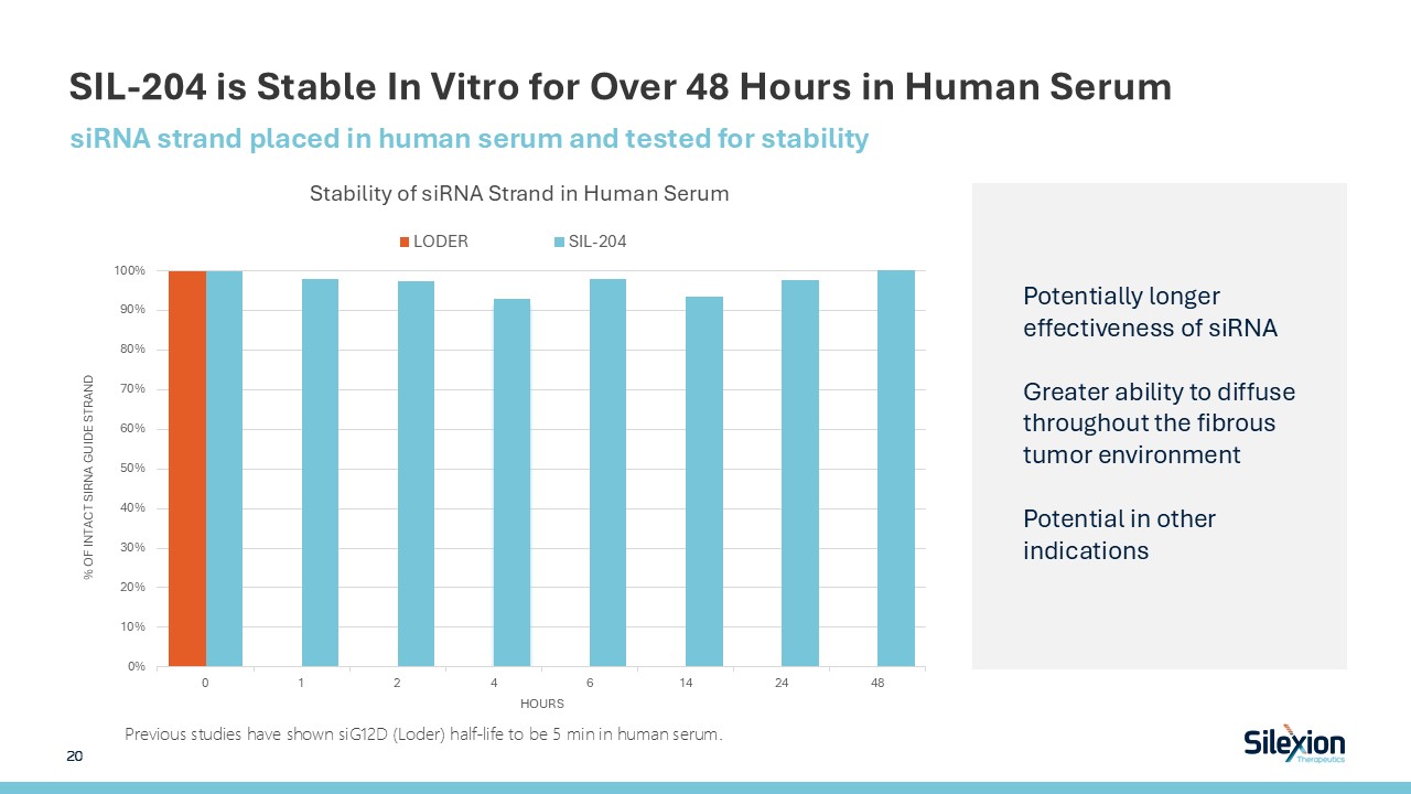 SIL-204 is Stable In Vitro for Over 48 Hours in Human Serum  siRNA strand placed in human serum and tested for stability  Stability of siRNA Strand in Human Serum   Potentially longer effectiveness of siRNA  Greater ability to diffuse throughout the fibrous tumor environment  Potential in other indications  20   Previous studies have shown siG12D (Loder) half-life to be 5 min in human serum.