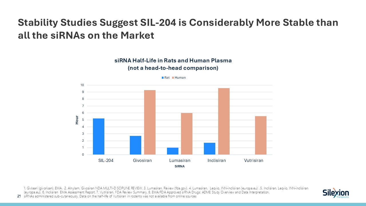 Stability Studies Suggest SIL-204 is Considerably More Stable than all the siRNAs on the Market  21   1. Givlaari (givorisan). EMA. 2. Alnylam. Givosiran NDA MULTI-DISCIPLINE REVIEW. 3. Lumasiran. Review (fda.gov). 4. Lumasiran. Leqvio, INN-inclisiran (europa.eu) . 5. Inclisiran. Leqvio, INN-inclisiran (europa.eu). 6. Inclisiran EMA Assessment Report. 7. Vutrisiran. FDA Review Summary. 8. EMA/FDA Approved siRNA Drugs: ADME Study Overview and Data Interpretation.siRNAs administered sub-cutaneously. Data on the half-life of Vultisiran in rodents was not available from online sources  Longer effectiveness of siRNA  Greater ability to diffuse throughout the fibrous tumor environment  Potential in other indications