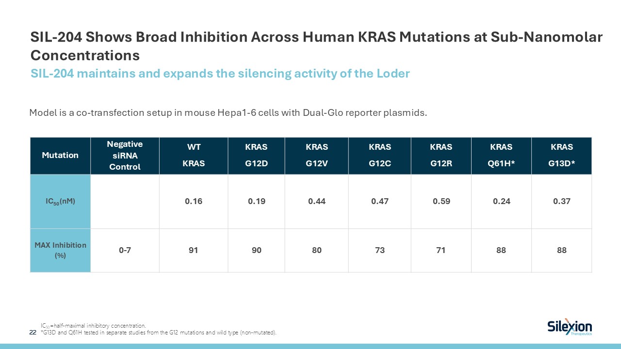 SIL-204 Shows Broad Inhibition Across Human KRAS Mutations at Sub-Nanomolar Concentrations  SIL-204 maintains and expands the silencing activity of the Loder  22   Model is a co-transfection setup in mouse Hepa1-6 cells with Dual-Glo reporter plasmids.  Mutation  NegativesiRNAControl  WT   KRAS  KRAS   G12D  KRAS   G12V  KRAS   G12C  KRAS   G12R  KRAS   Q61H*  KRAS  G13D*  IC50 (nM)  0.16  0.19  0.44  0.47  0.59  0.24  0.37  MAX Inhibition (%)  0-7  91  90  80  73  71  88  88  IC50=half-maximal inhibitory concentration.   *G13D and Q61H tested in separate studies from the G12 mutations and wild type (non-mutated).
