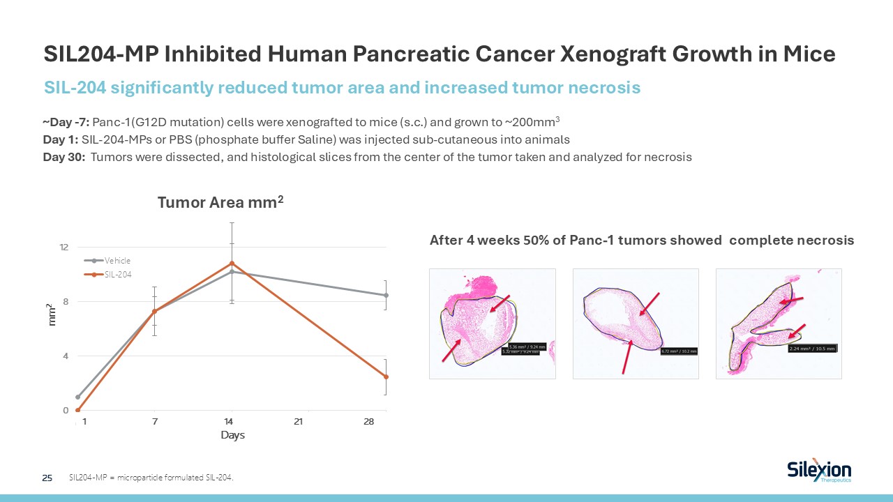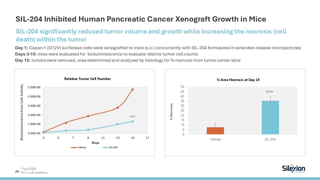 SIL-204 Inhibited Human Pancreatic Cancer Xenograft Growth in Mice  ***p<0.0005  S.C. = sub cutaneous.  SIL-204 significantly reduced tumor volume and growth while increasing the necrosis (cell death) within the tumor   Day 1: Capan-1 (G12V) luciferase cells were xenografted to mice (s.c.) concurrently with SIL-204 formulated in extended-release microparticles  Days 3-15: mice were evaluated for bioluminescence to evaluate relative tumor cell counts  Day 15: tumors were removed, area determined and analyzed by histology for % necrosis from tumor center slice  24   % Necrosis  ***  Bioluminescence from LUC Activity   ***
