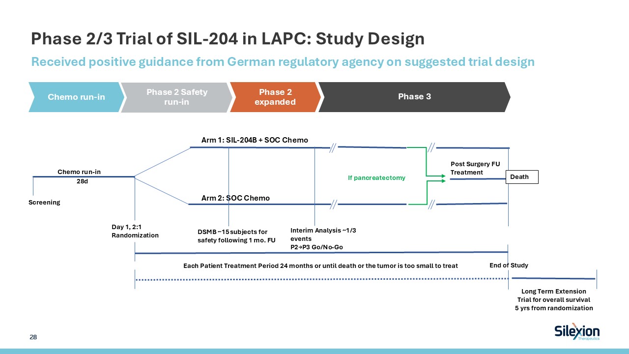 SIL-204 Development Strategy in LAPC   2023  2024  H1 2025  H2 2025  H1 2026  H2 2026  Clinical proof of concept for Loder in LAPC in an approvable endpoint for FDA  Optimization of siRNA on various fronts; selection of SIL-204 with new extended-release formulation  Received guidance on trial design from the German Federal Institute for Drugs and Medical Devices (BfArM), intratumor administration  Initiate toxicology studies SIL-204  GMP production API (SIL-204)  GMP production injectable formulation  Submit CTA in E.U. for Phase 2/3  Initiate Phase 2/3, LAPC Germany/Israel  Leverage safety clinical data from first trial segment Phase 2/3   Pre-IND meeting FDA  Submit IND to FDA  Expand Phase 2/3 to USA\additional EU, etc   27   Indicates completed activity. Unmarked activities to be performed.  Meeting with German authorities for regulatory buy-in (BfArM) Integrated Regimen  GMP production MP formulation