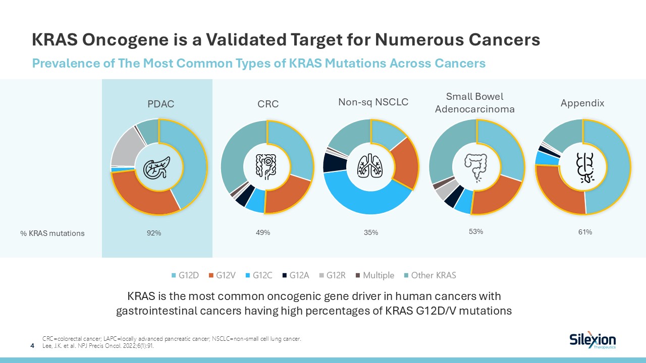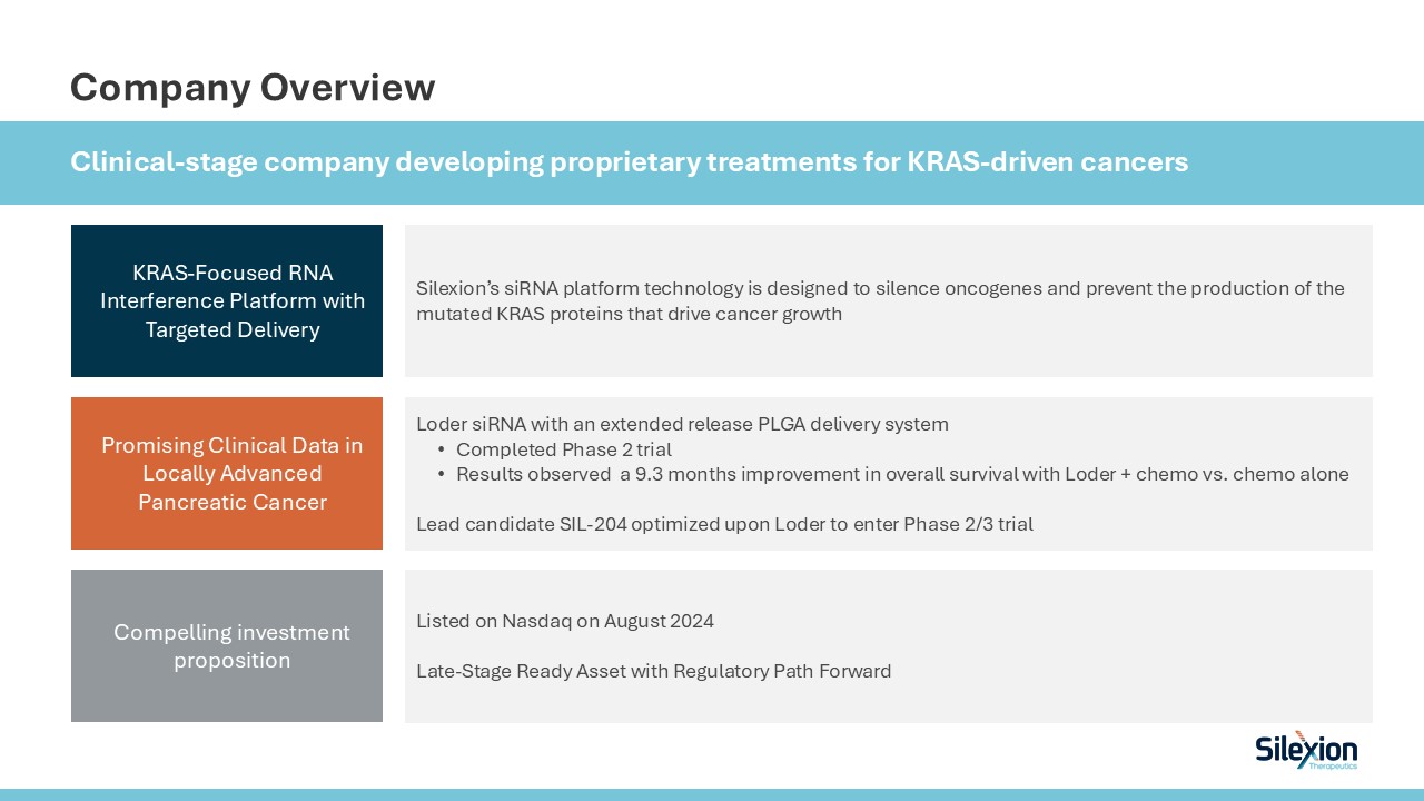Company Overview  Silexion’s siRNA platform technology is designed to silence oncogenes and prevent the production of the mutated KRAS proteins that drive cancer growth  Loder siRNA with an extended release PLGA delivery system  Completed Phase 2 trial  Results observed a 9.3 months improvement in overall survival with Loder + chemo vs. chemo alone  Lead candidate SIL-204 optimized upon Loder to enter Phase 2/3 trial  Listed on Nasdaq on August 2024  Late-Stage Ready Asset with Regulatory Path Forward  Clinical-stage company developing proprietary treatments for KRAS-driven cancers  KRAS-Focused RNA Interference Platform with Targeted Delivery   Promising Clinical Data in Locally Advanced Pancreatic Cancer  Compelling investment proposition