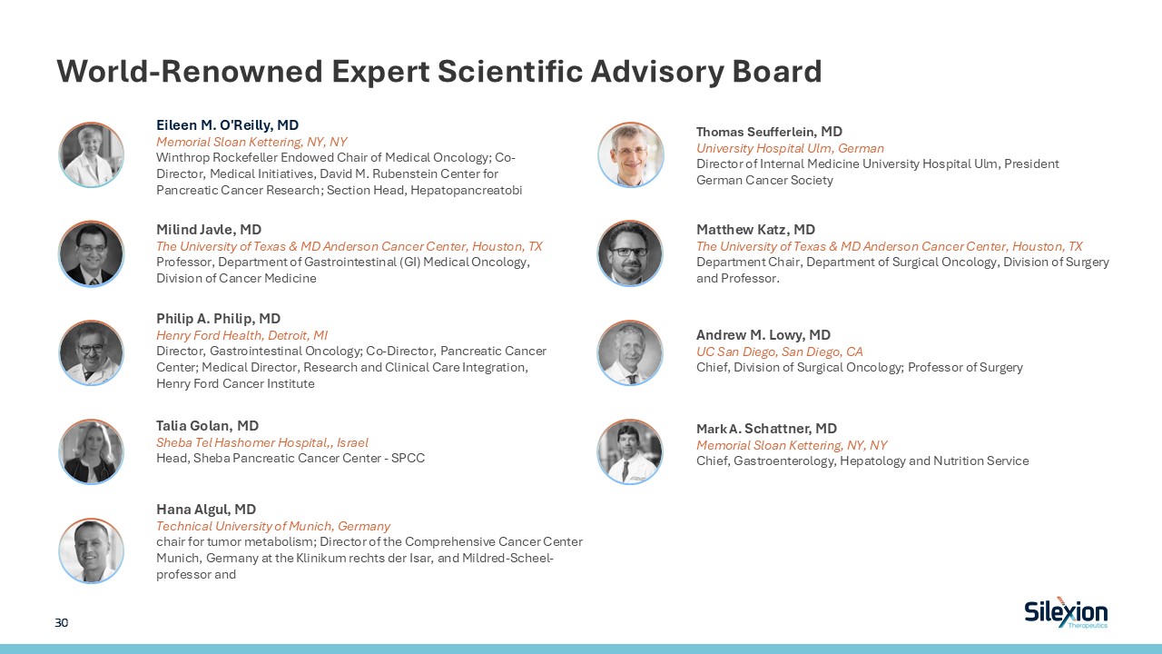 World-Renowned Expert Scientific Advisory Board  Eileen M. O'Reilly, MD  Memorial Sloan Kettering, NY, NY  Winthrop Rockefeller Endowed Chair of Medical Oncology; Co-Director, Medical Initiatives, David M. Rubenstein Center for Pancreatic Cancer Research; Section Head, Hepatopancreatobi  Hana Algul, MD  Technical University of Munich, Germany  chair for tumor metabolism; Director of the Comprehensive Cancer Center Munich, Germany at the Klinikum rechts der Isar, and Mildred-Scheel-professor and   Milind Javle, MD  The University of Texas & MD Anderson Cancer Center, Houston, TX  Professor, Department of Gastrointestinal (GI) Medical Oncology, Division of Cancer Medicine  Philip A. Philip, MD   Henry Ford Health, Detroit, MI  Director, Gastrointestinal Oncology; Co-Director, Pancreatic Cancer Center; Medical Director, Research and Clinical Care Integration, Henry Ford Cancer Institute  Talia Golan, MD  Sheba Tel Hashomer Hospital,, Israel  Head, Sheba Pancreatic Cancer Center - SPCC  Matthew Katz, MD  The University of Texas & MD Anderson Cancer Center, Houston, TX  Department Chair, Department of Surgical Oncology, Division of Surgery and Professor.  Andrew M. Lowy, MD  UC San Diego, San Diego, CA  Chief, Division of Surgical Oncology; Professor of Surgery  Mark A. Schattner, MD  Memorial Sloan Kettering, NY, NY  Chief, Gastroenterology, Hepatology and Nutrition Service  30   Thomas Seufferlein, MD  University Hospital Ulm, German  Director of Internal Medicine University Hospital Ulm, President German Cancer Society