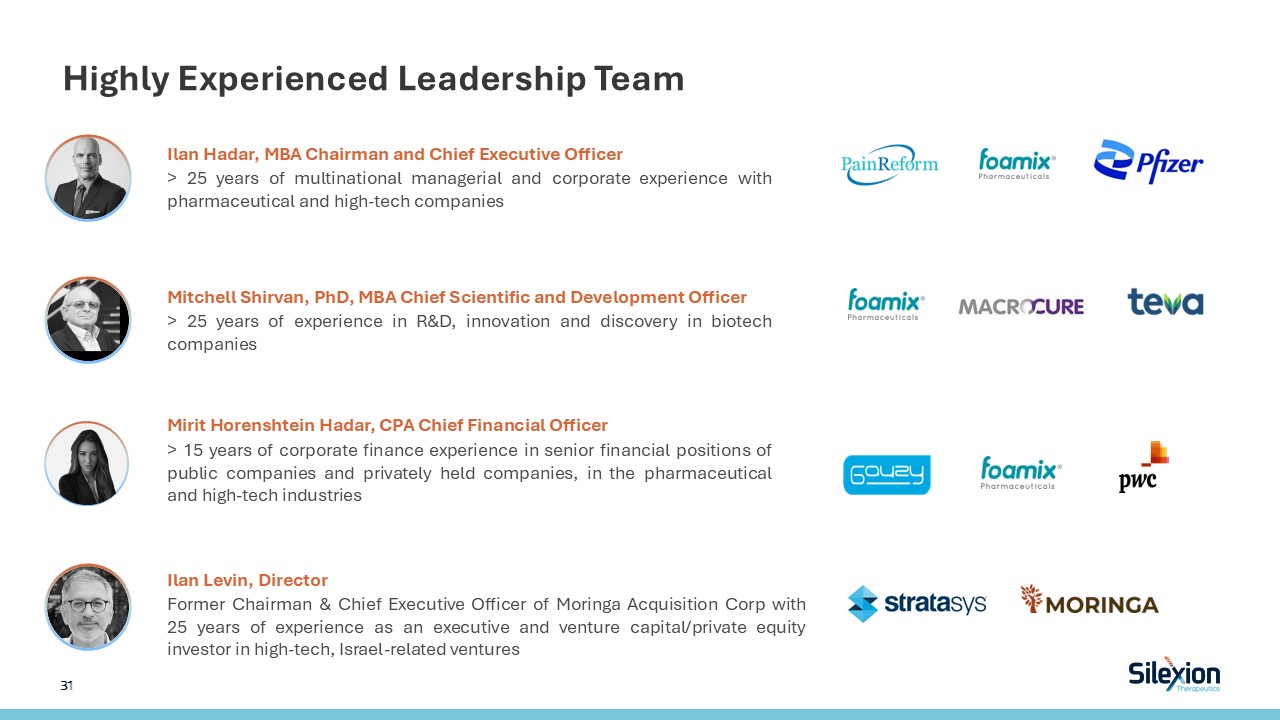 Highly Experienced Leadership Team  Ilan Hadar, MBA Chairman and Chief Executive Officer  > 25 years of multinational managerial and corporate experience with pharmaceutical and high-tech companies  Mitchell Shirvan, PhD, MBA Chief Scientific and Development Officer  > 25 years of experience in R&D, innovation and discovery in biotech companies  Mirit Horenshtein Hadar, CPA Chief Financial Officer  > 15 years of corporate finance experience in senior financial positions of public companies and privately held companies, in the pharmaceutical and high-tech industries  Ilan Levin, Director   Former Chairman & Chief Executive Officer of Moringa Acquisition Corp with 25 years of experience as an executive and venture capital/private equity investor in high-tech, Israel-related ventures  31
