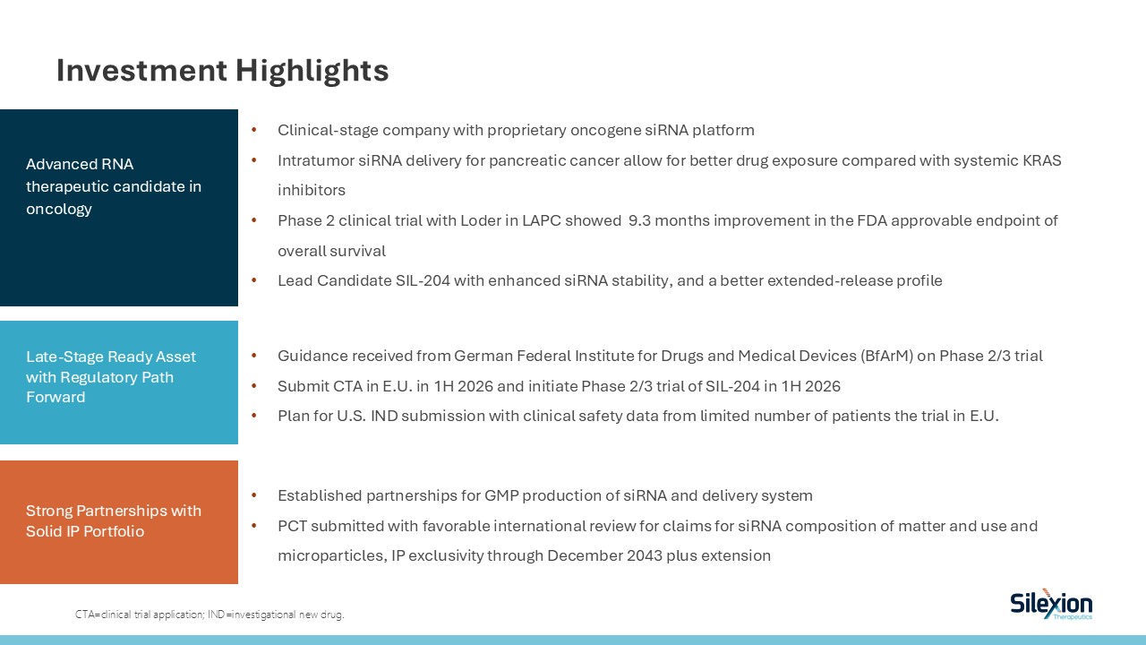 Investment Highlights  CTA=clinical trial application; IND=investigational new drug.   Clinical-stage company with proprietary oncogene siRNA platform  Intratumor siRNA delivery for pancreatic cancer allow for better drug exposure compared with systemic KRAS inhibitors   Phase 2 clinical trial with Loder in LAPC showed 9.3 months improvement in the FDA approvable endpoint of overall survival  Lead Candidate SIL-204 with enhanced siRNA stability, and a better extended-release profile  Advanced RNA therapeutic candidate in oncology  Late-Stage Ready Asset with Regulatory Path Forward  Strong Partnerships with Solid IP Portfolio   Guidance received from German Federal Institute for Drugs and Medical Devices (BfArM) on Phase 2/3 trial  Submit CTA in E.U. in 1H 2026 and initiate Phase 2/3 trial of SIL-204 in 1H 2026   Plan for U.S. IND submission with clinical safety data from limited number of patients the trial in E.U.  Established partnerships for GMP production of siRNA and delivery system  PCT submitted with favorable international review for claims for siRNA composition of matter and use and microparticles, IP exclusivity through December 2043 plus extension